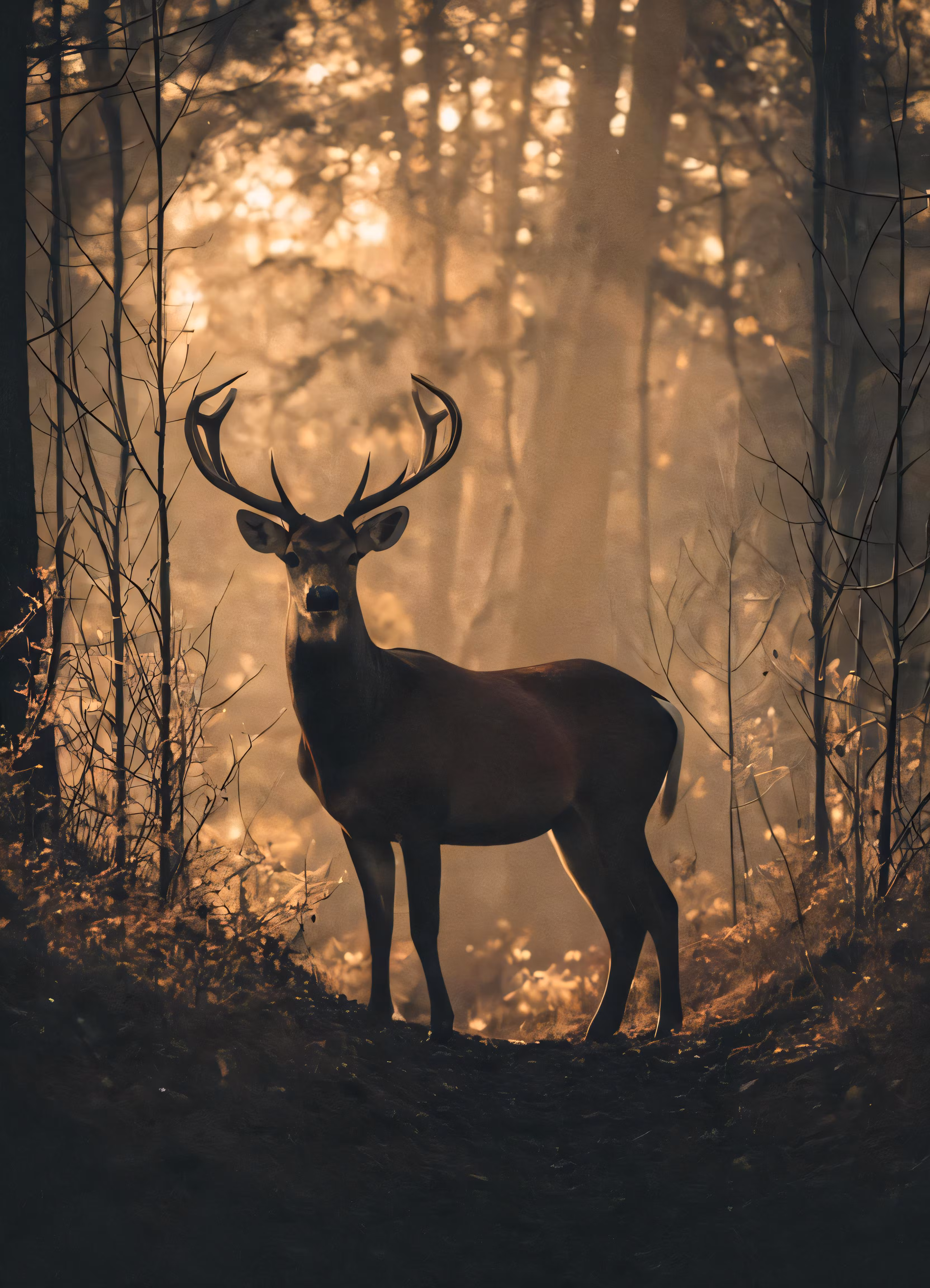 High resolution picture, free to use, a deer stands on a path surrounded by trees