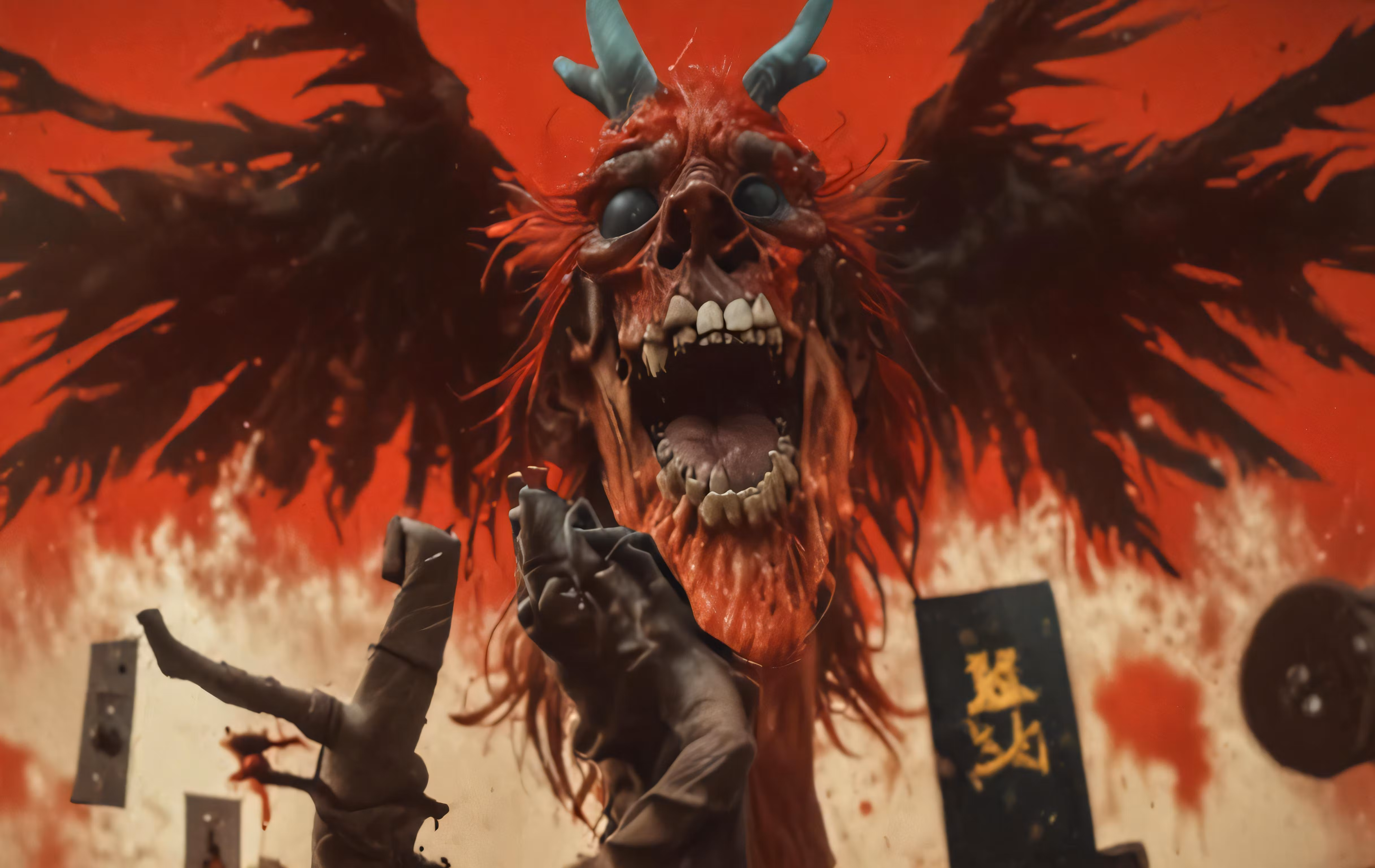 High resolution picture, free to use, a demonic figure standing in front of a red wall