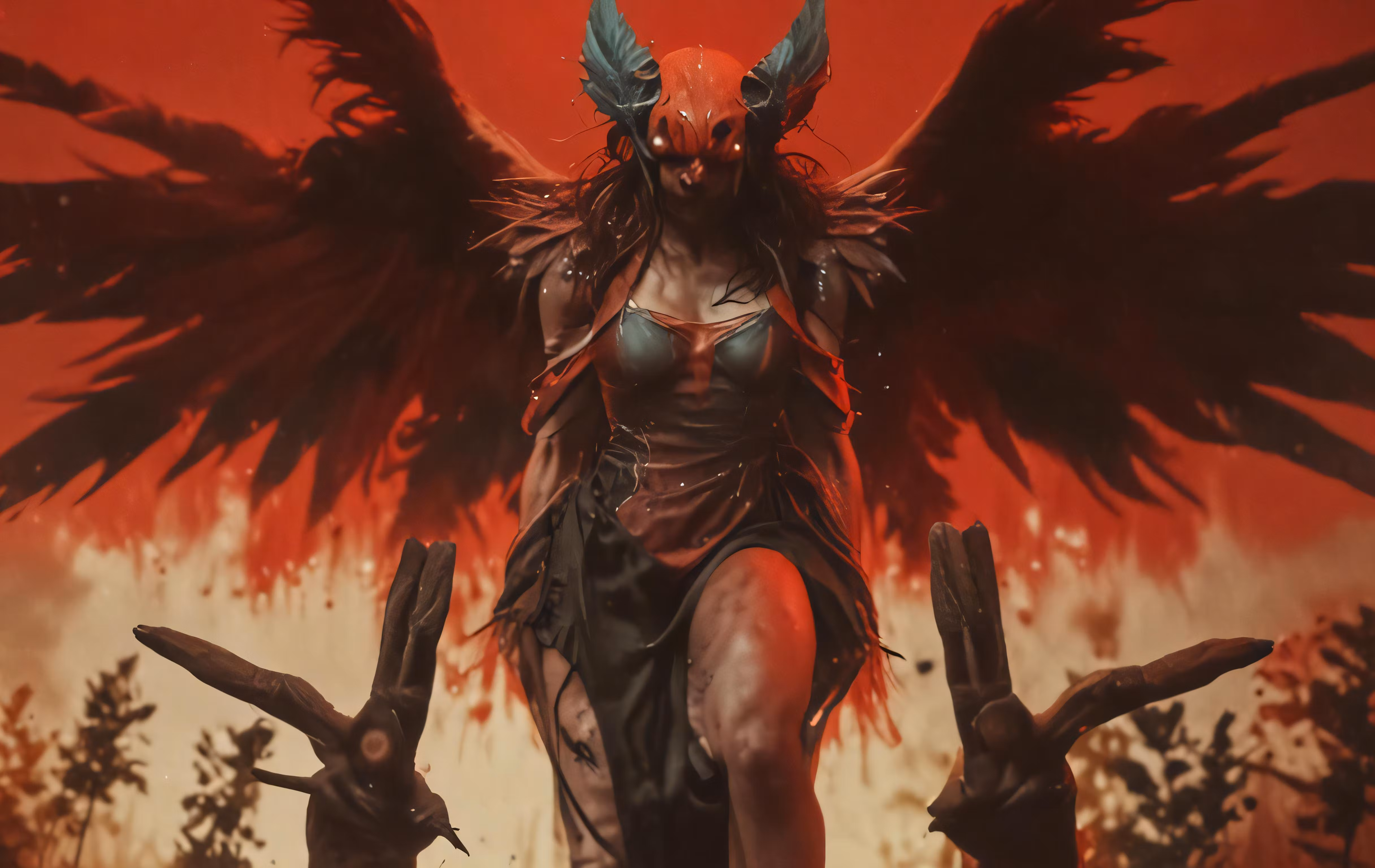 High resolution picture, free to use, a demonic girl with angel wings stands on red, gloomy hills