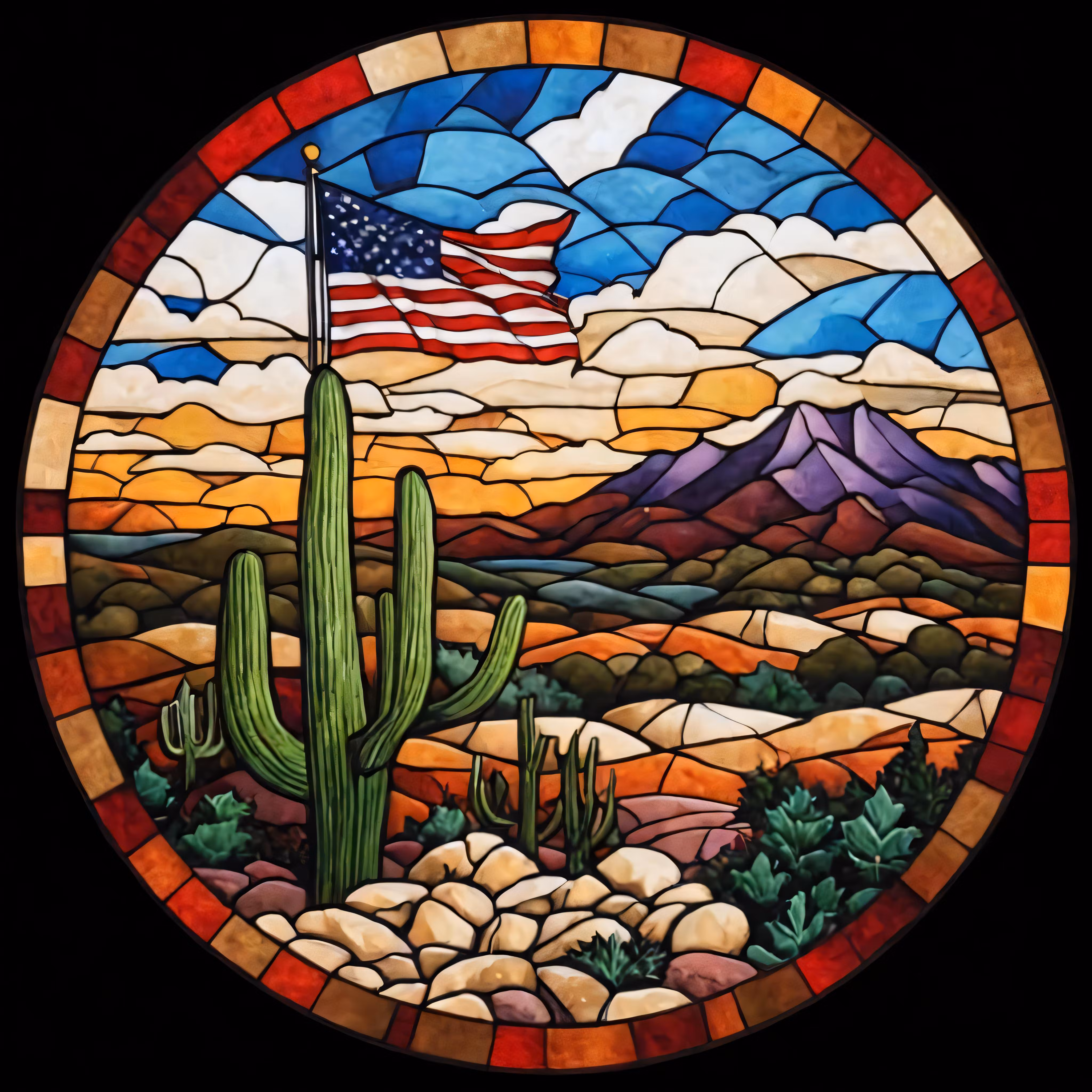High resolution picture, free to use, a desert scene with an american flag stained in glass