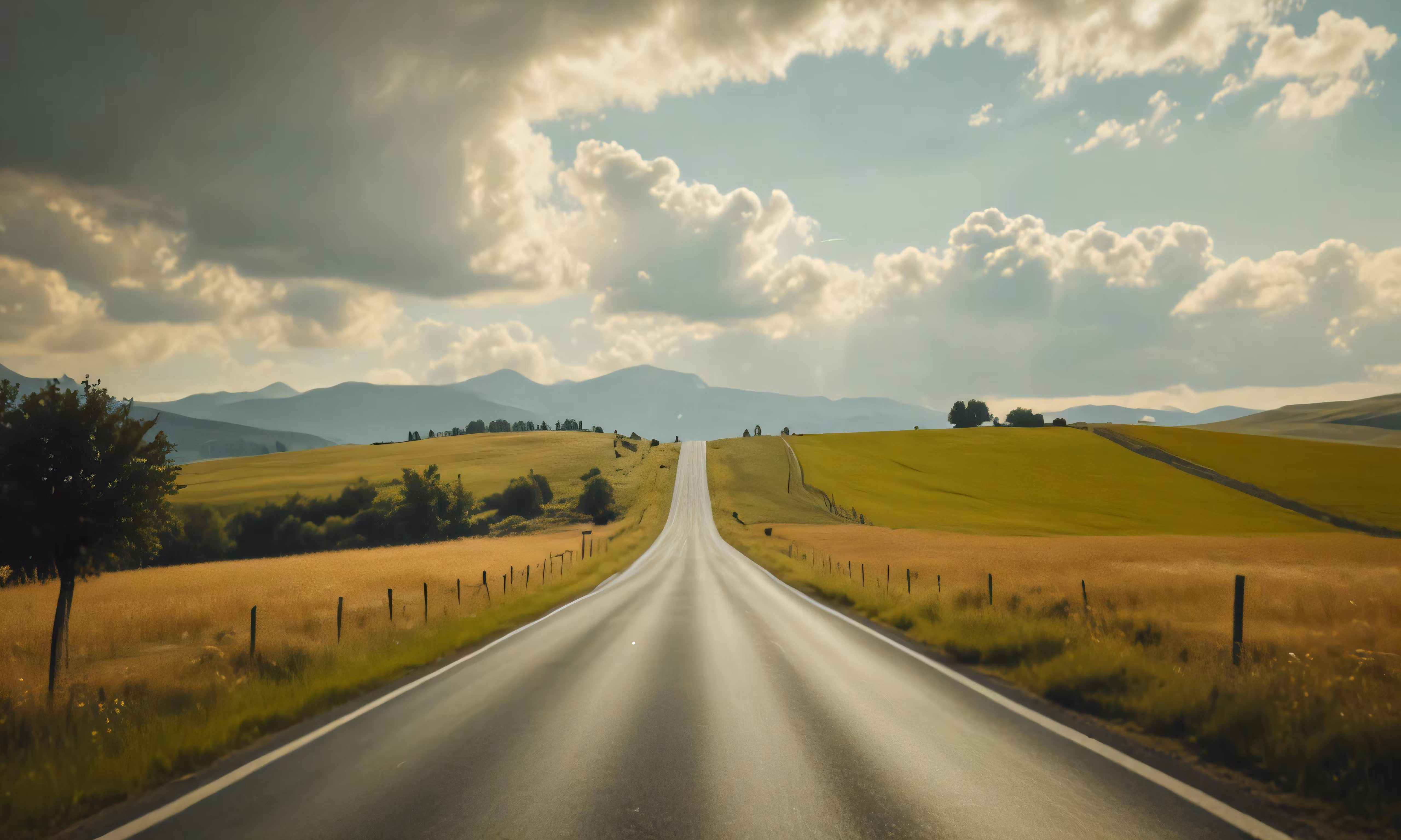 High resolution picture, free to use, a deserted road is shown during a partly cloudy day