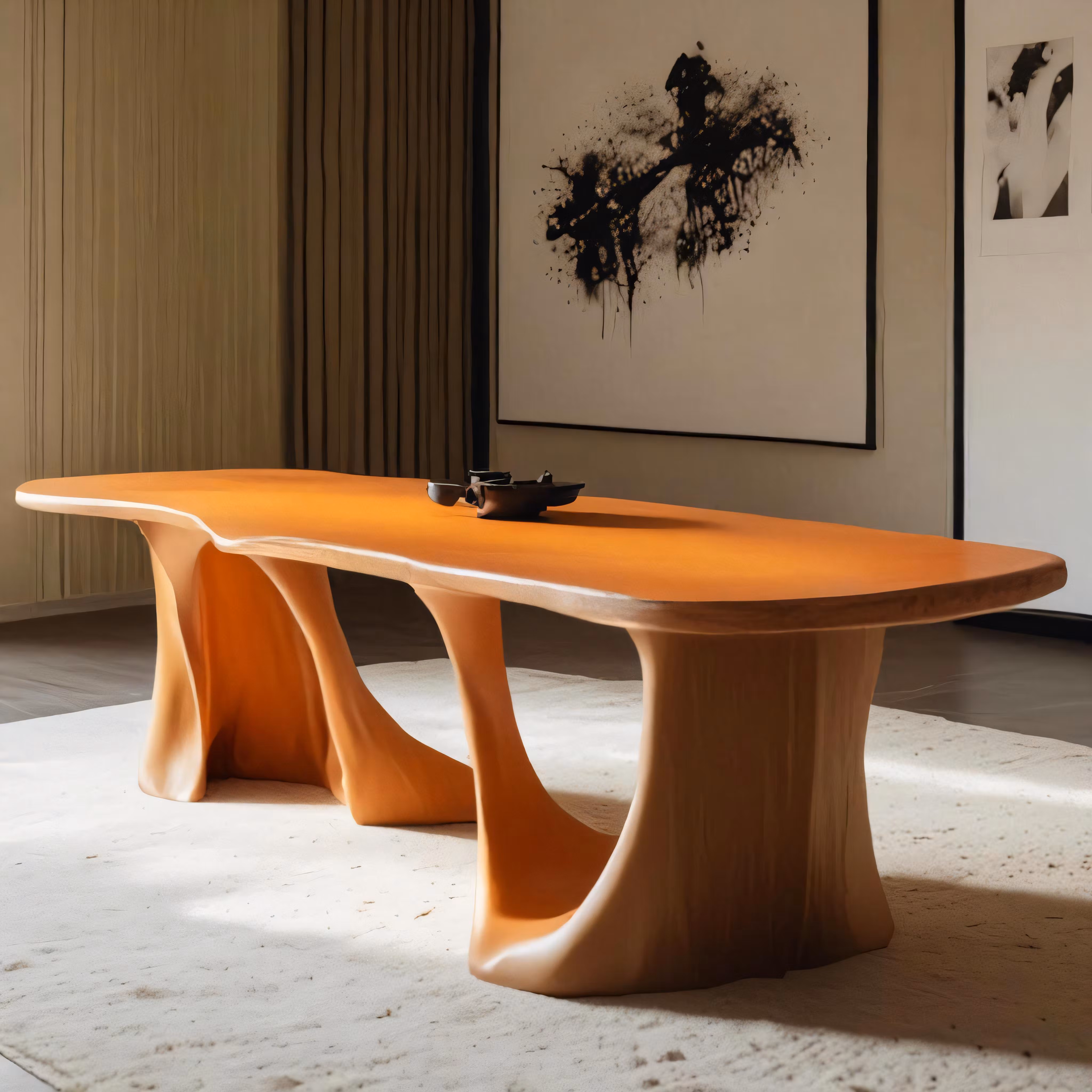 High resolution picture, free to use, a desk sits in front of an art piece