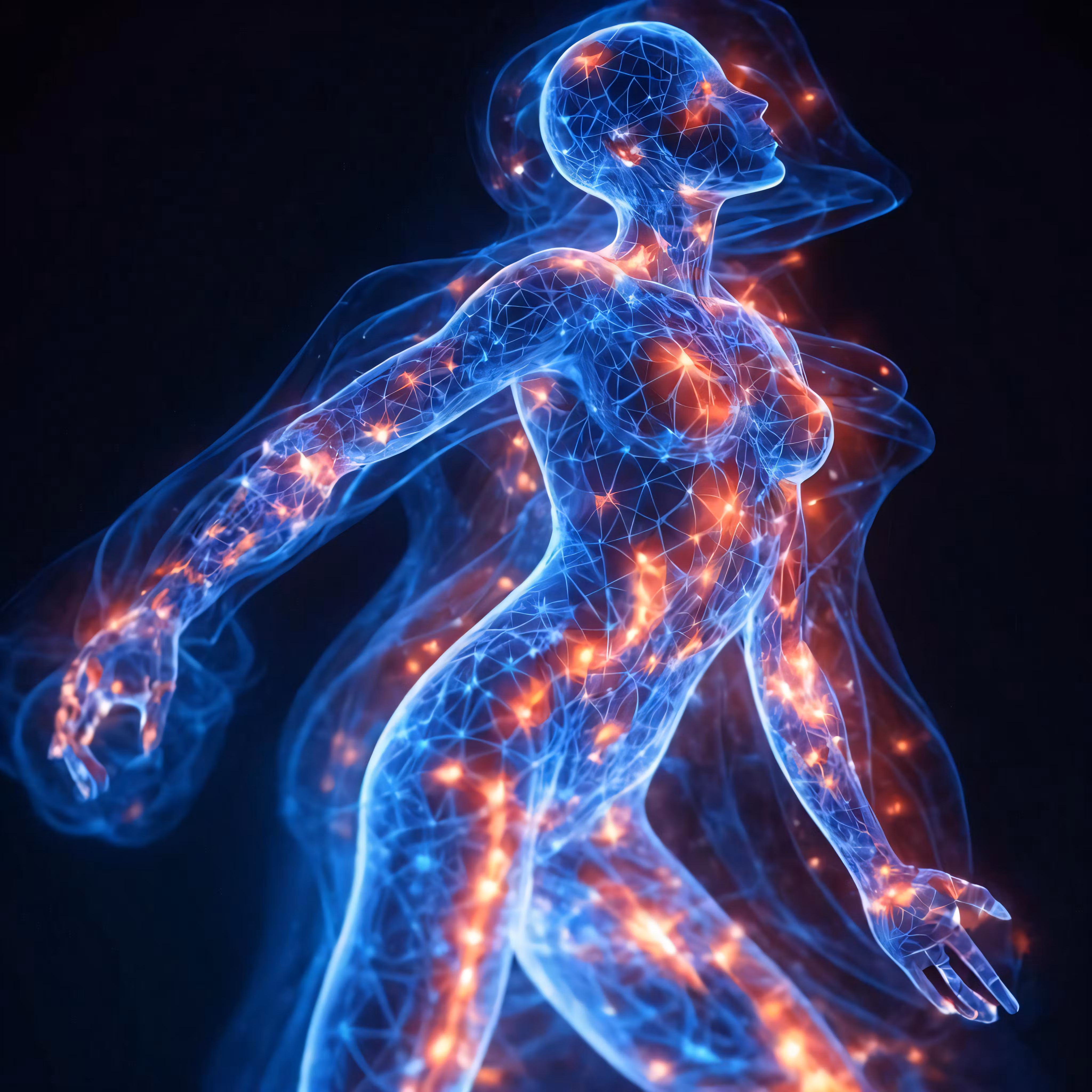 High resolution picture, free to use, a digital illustration of a woman with red lights running