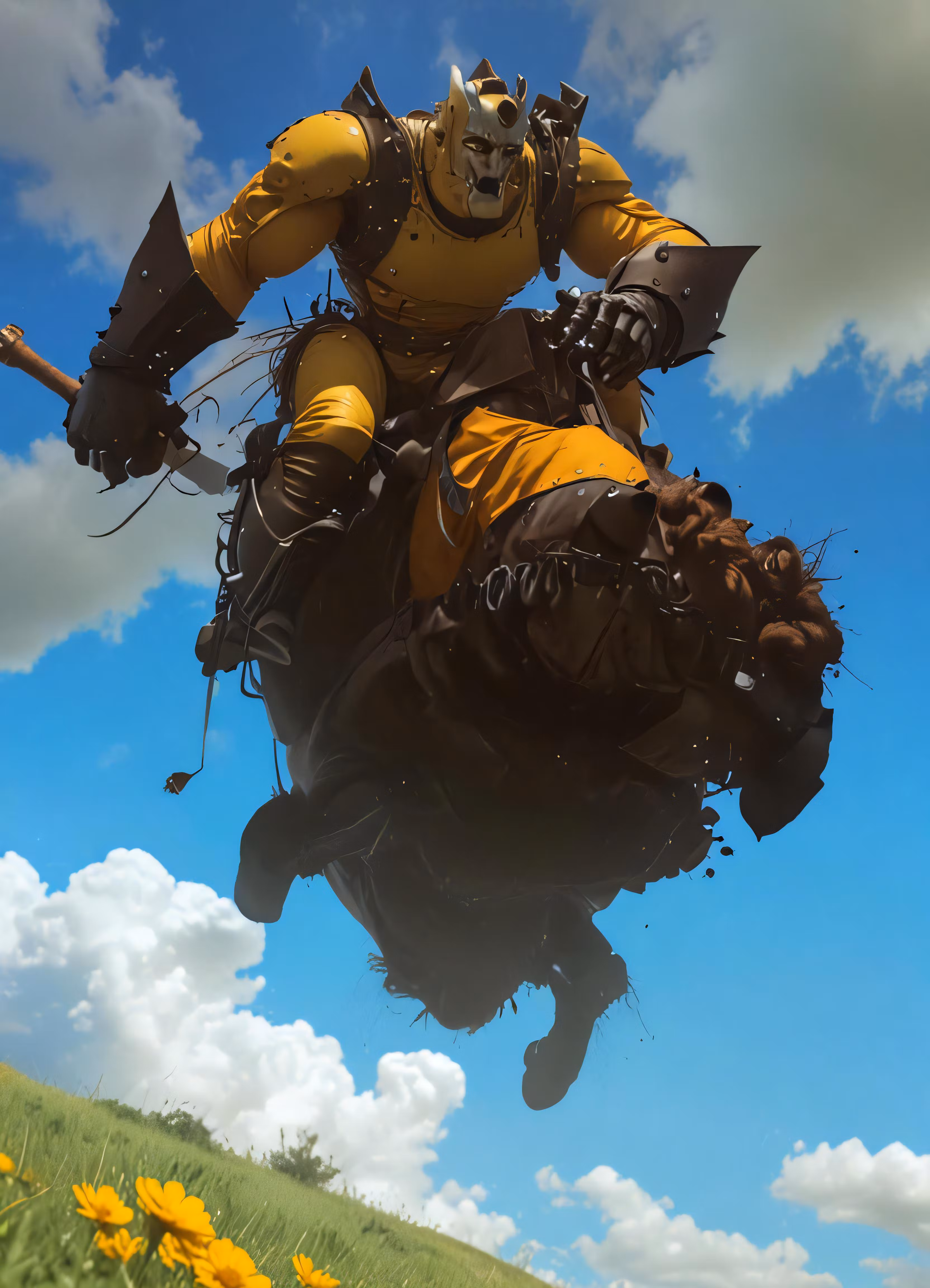 High resolution picture, free to use, a digital rendering of a robot man riding a horse