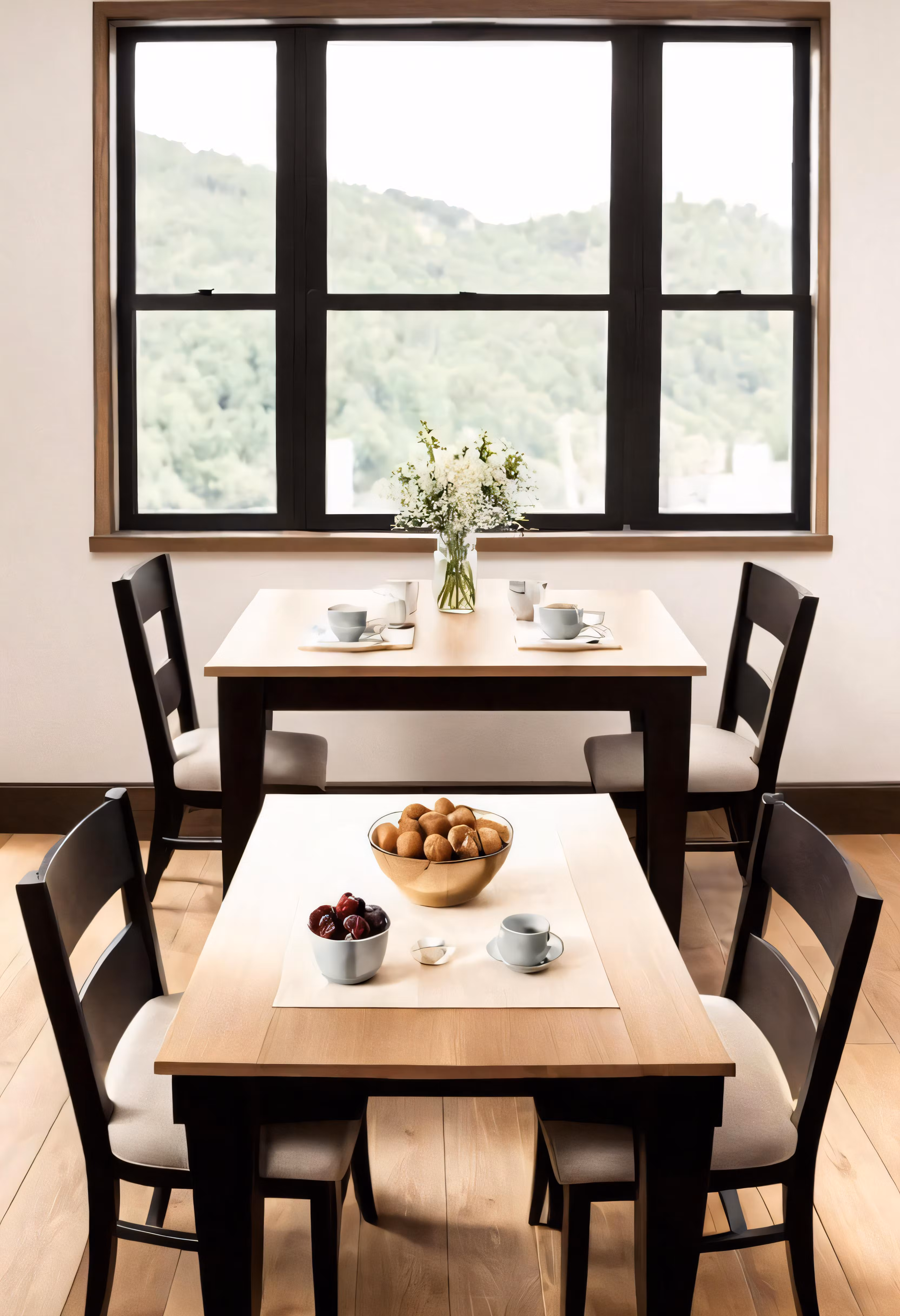 High resolution picture, free to use, a dinning room table set with chairs next to a window