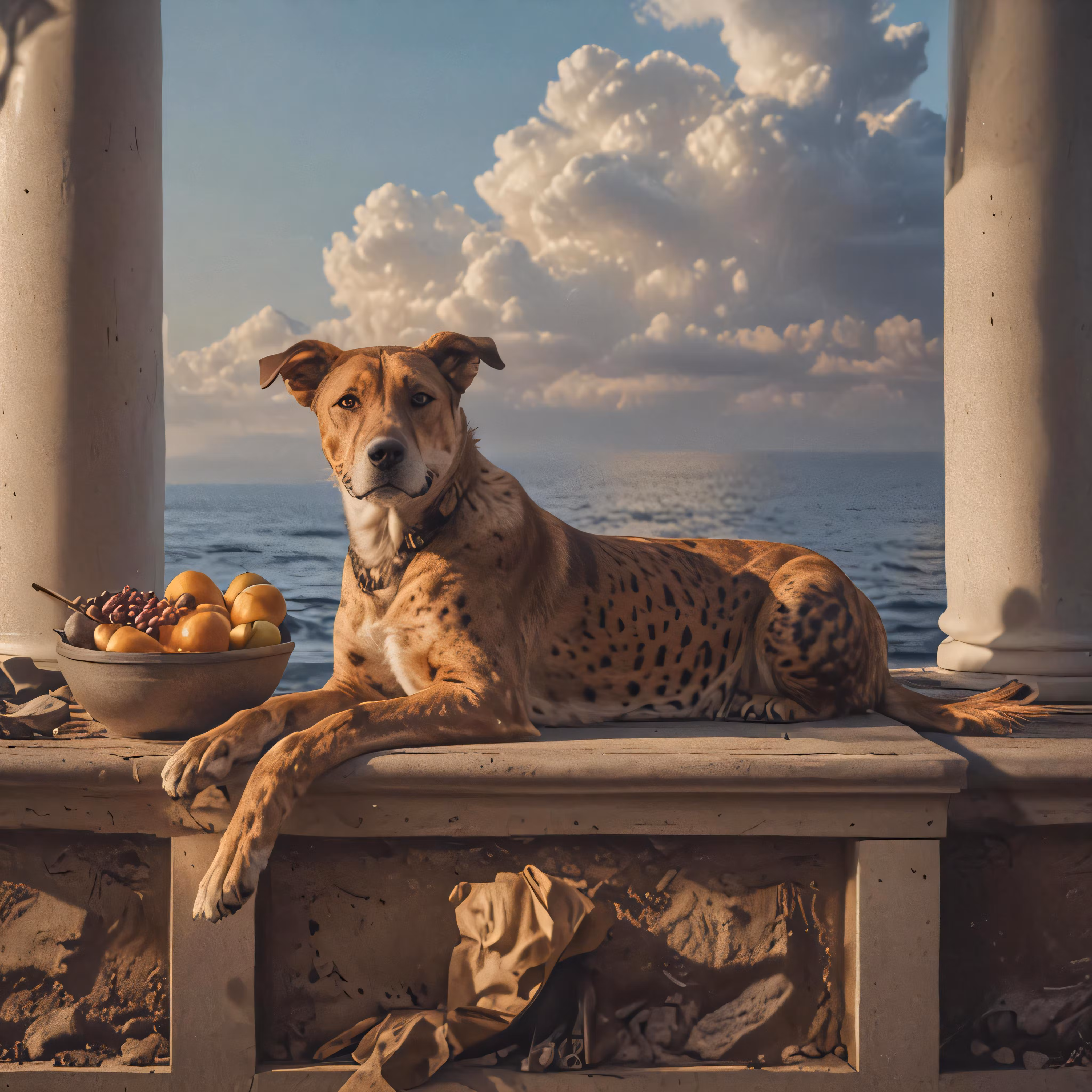 High resolution picture, free to use, a dog and bowl on the front porch of a house