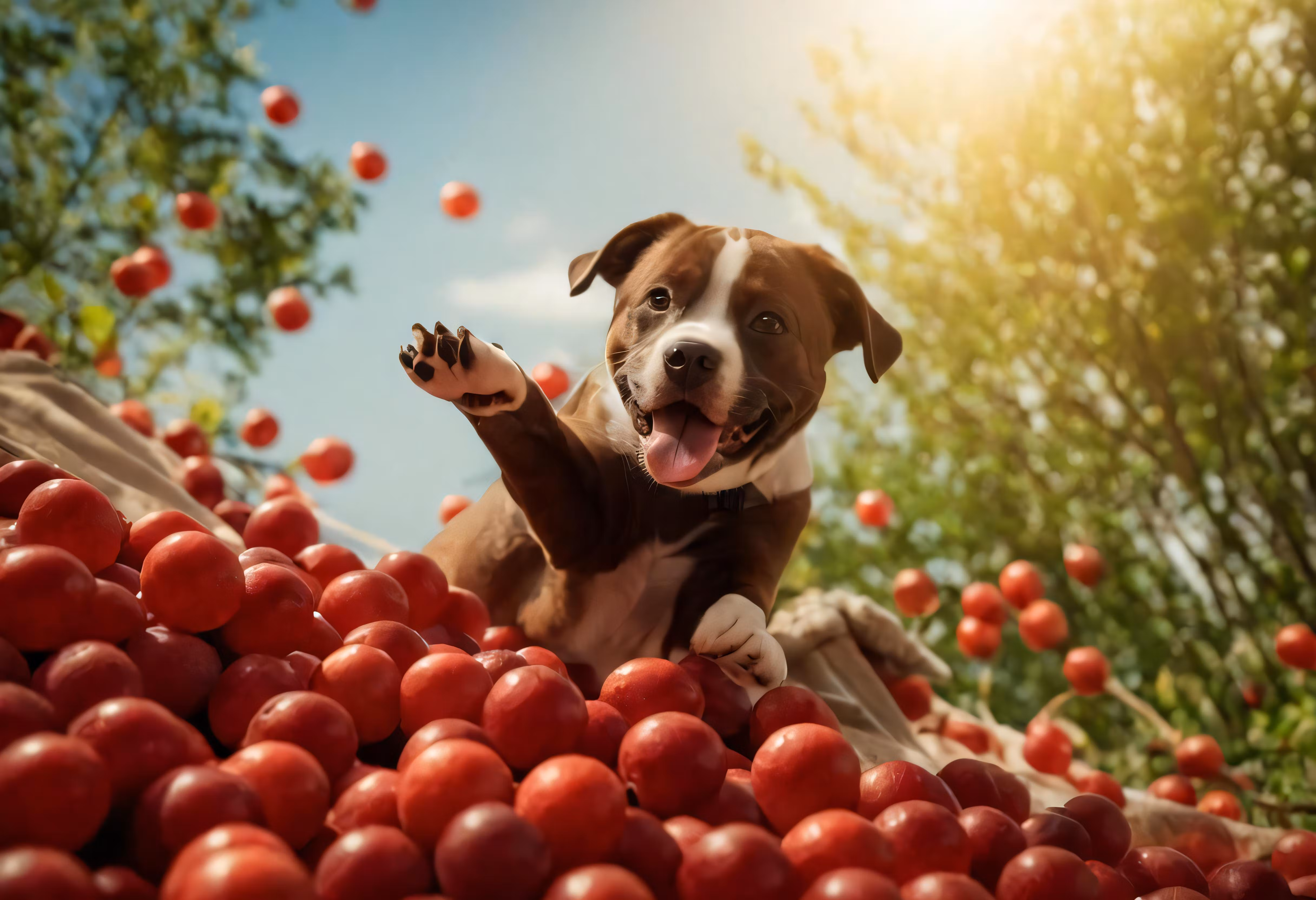 High resolution picture, free to use, a dog climbing on top of some apples with his paws up