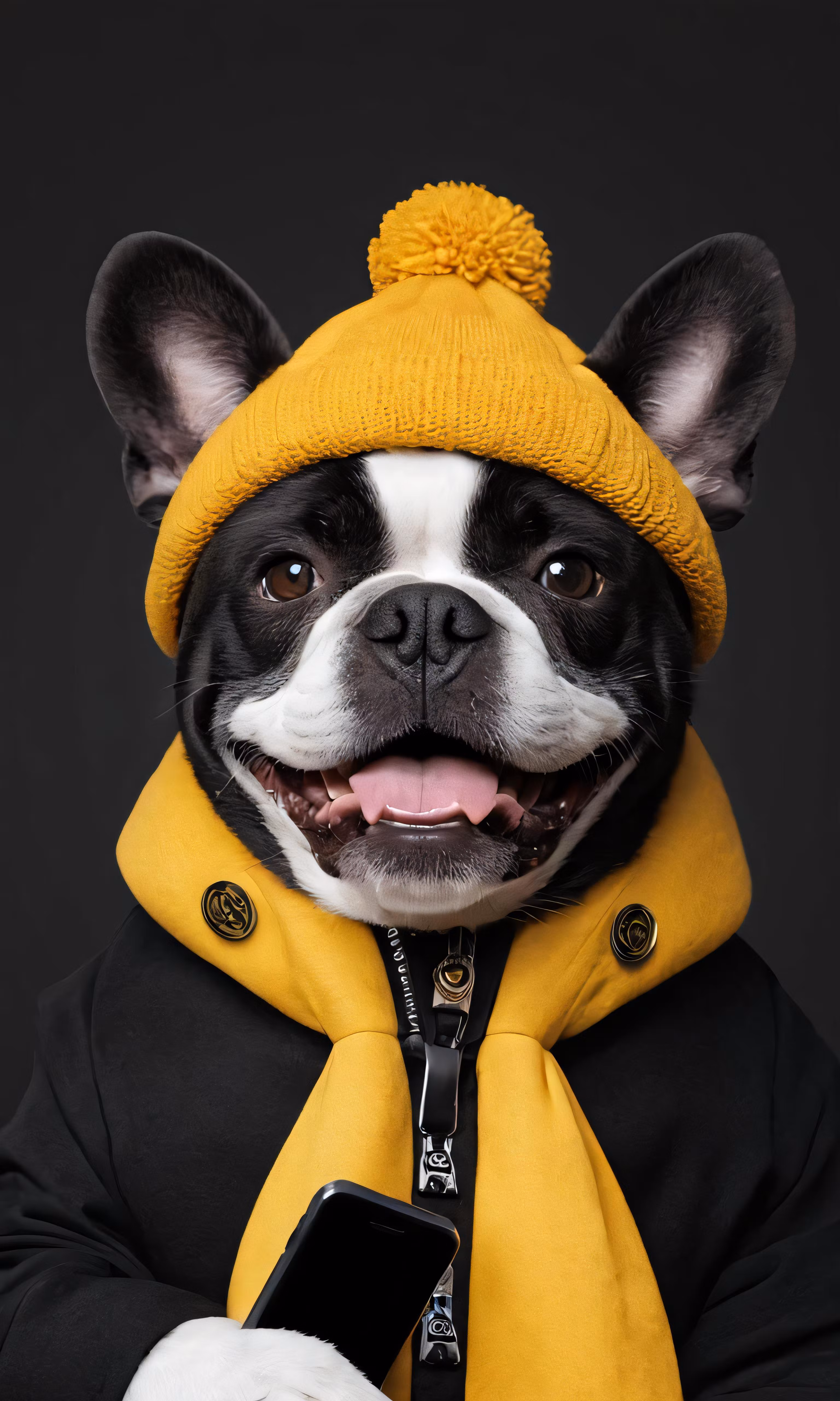 High resolution picture, free to use, a dog dressed up in a yellow coat with a cell phone
