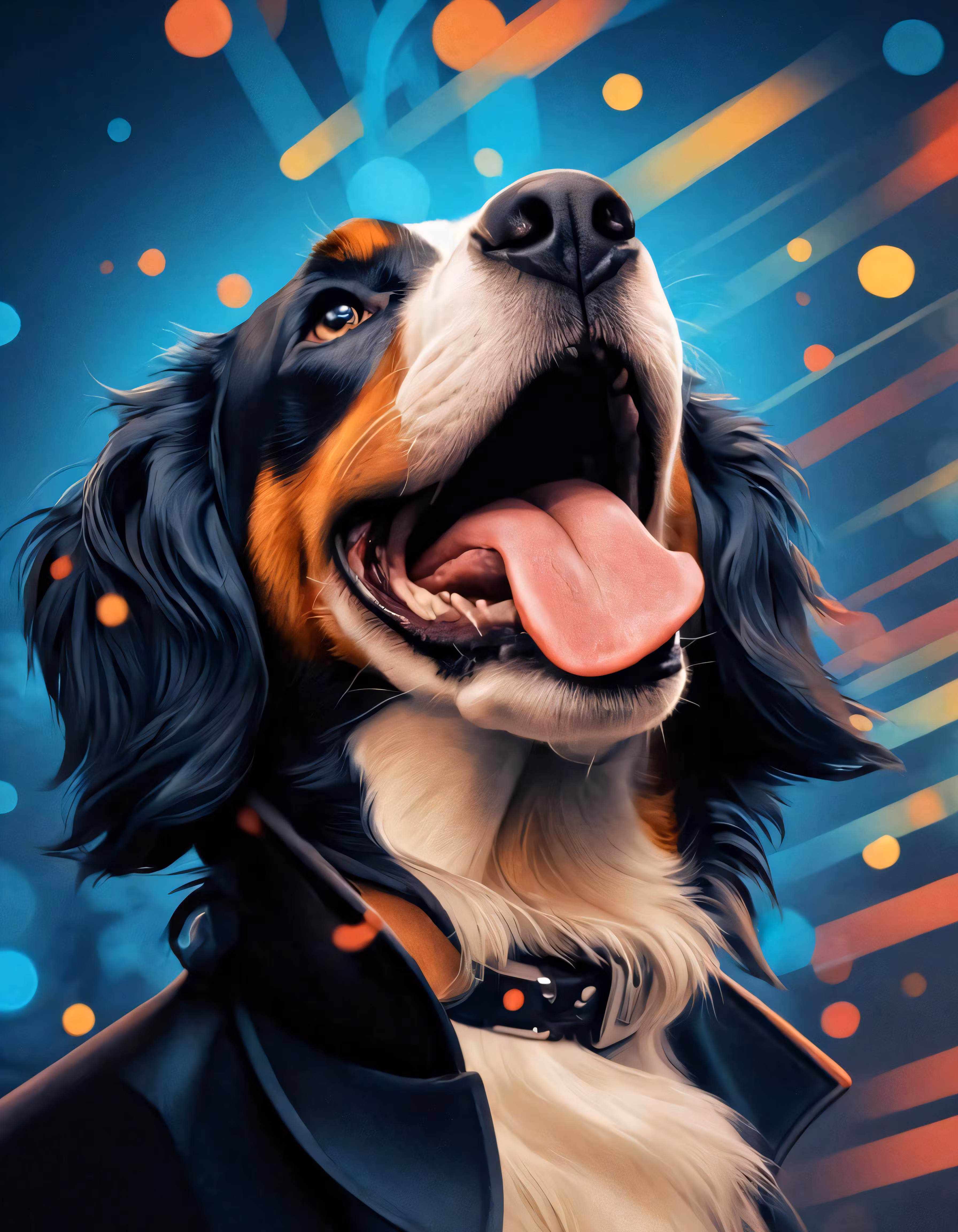 High resolution picture, free to use, a dog has its mouth open, with some circles in the background
