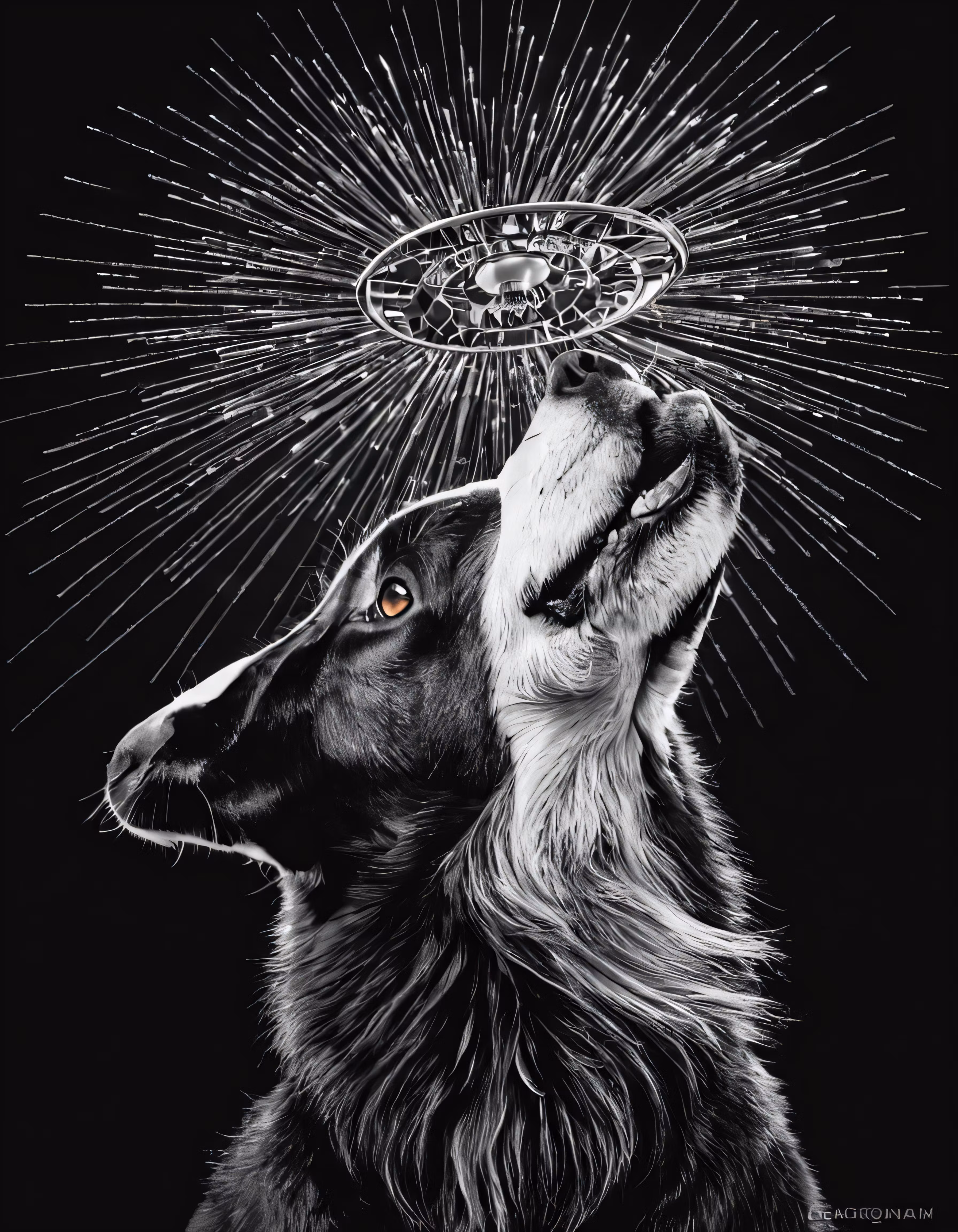 High resolution picture, free to use, a dog in black and white looking up at the sky with the word, it is a