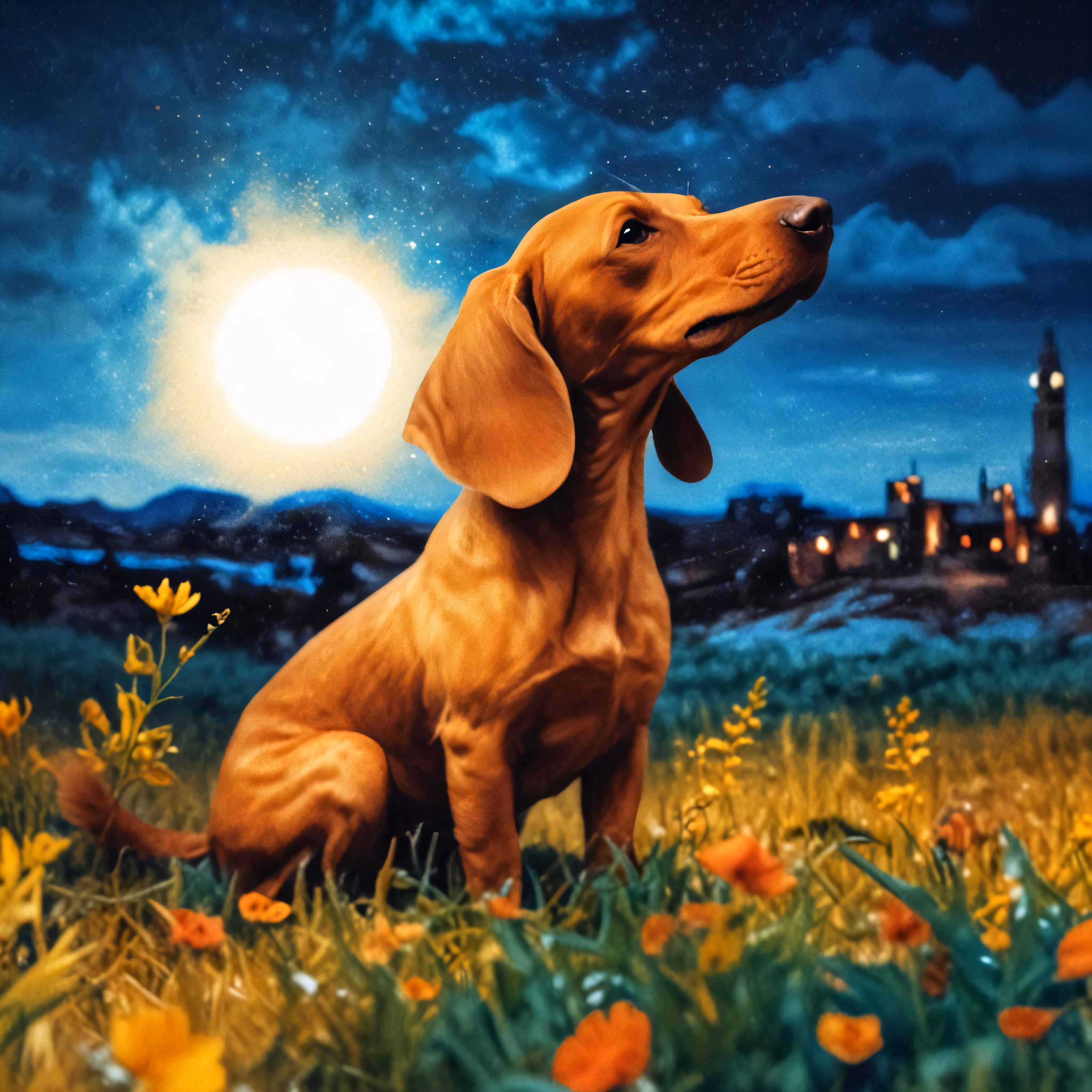 High resolution picture, free to use, a dog in the field is looking at the sky
