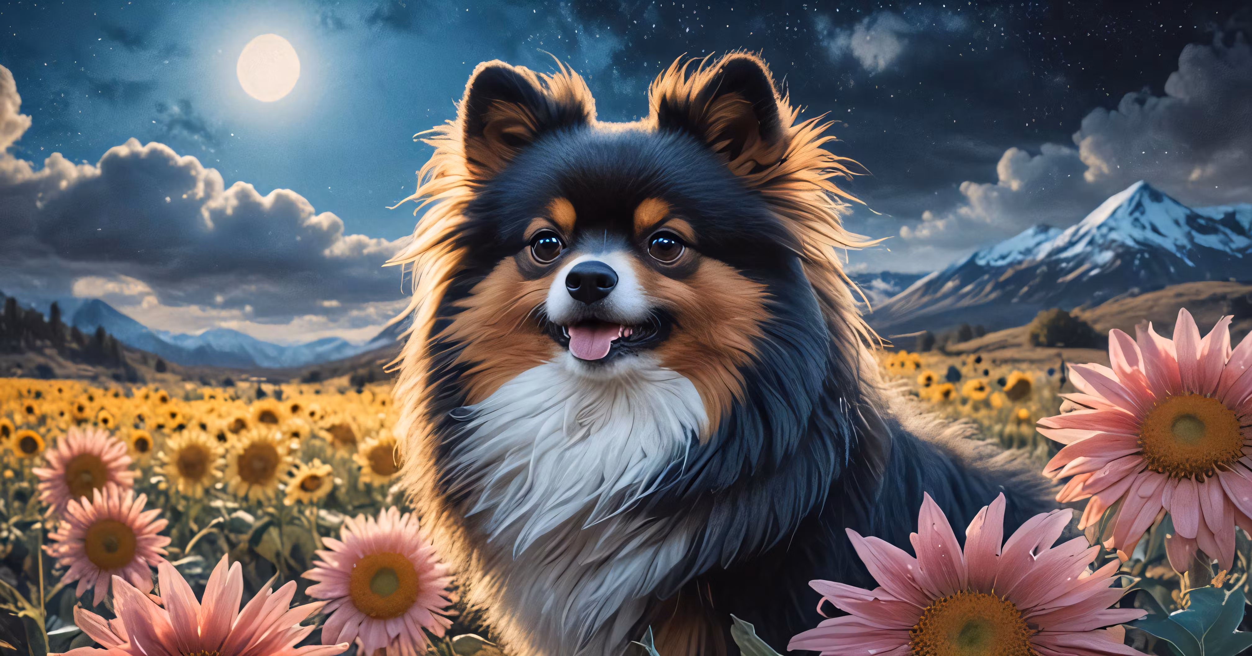 High resolution picture, free to use, a dog in the middle of flowers with mountains in the background