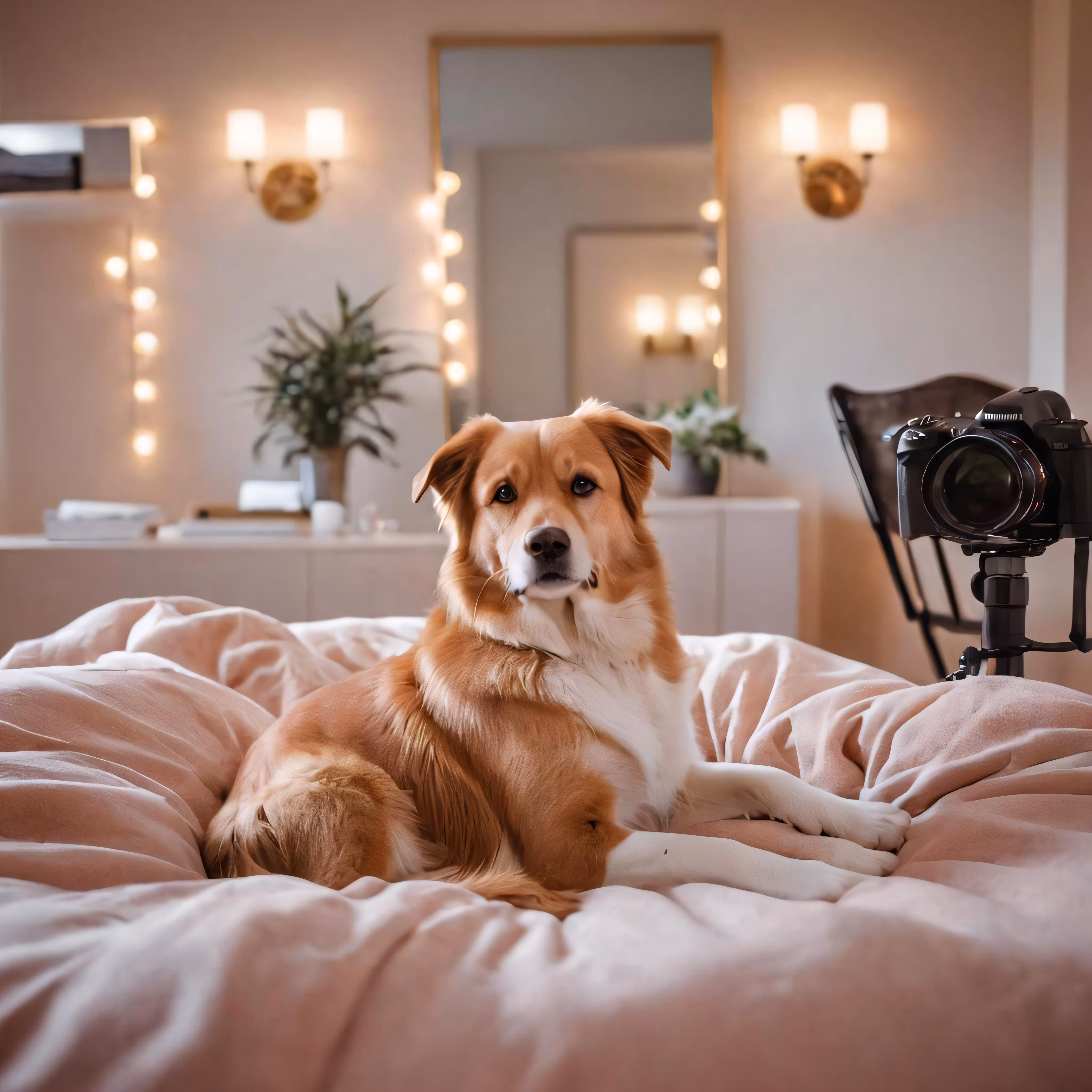 High resolution picture, free to use, a dog is laying on top of a bed near a camera