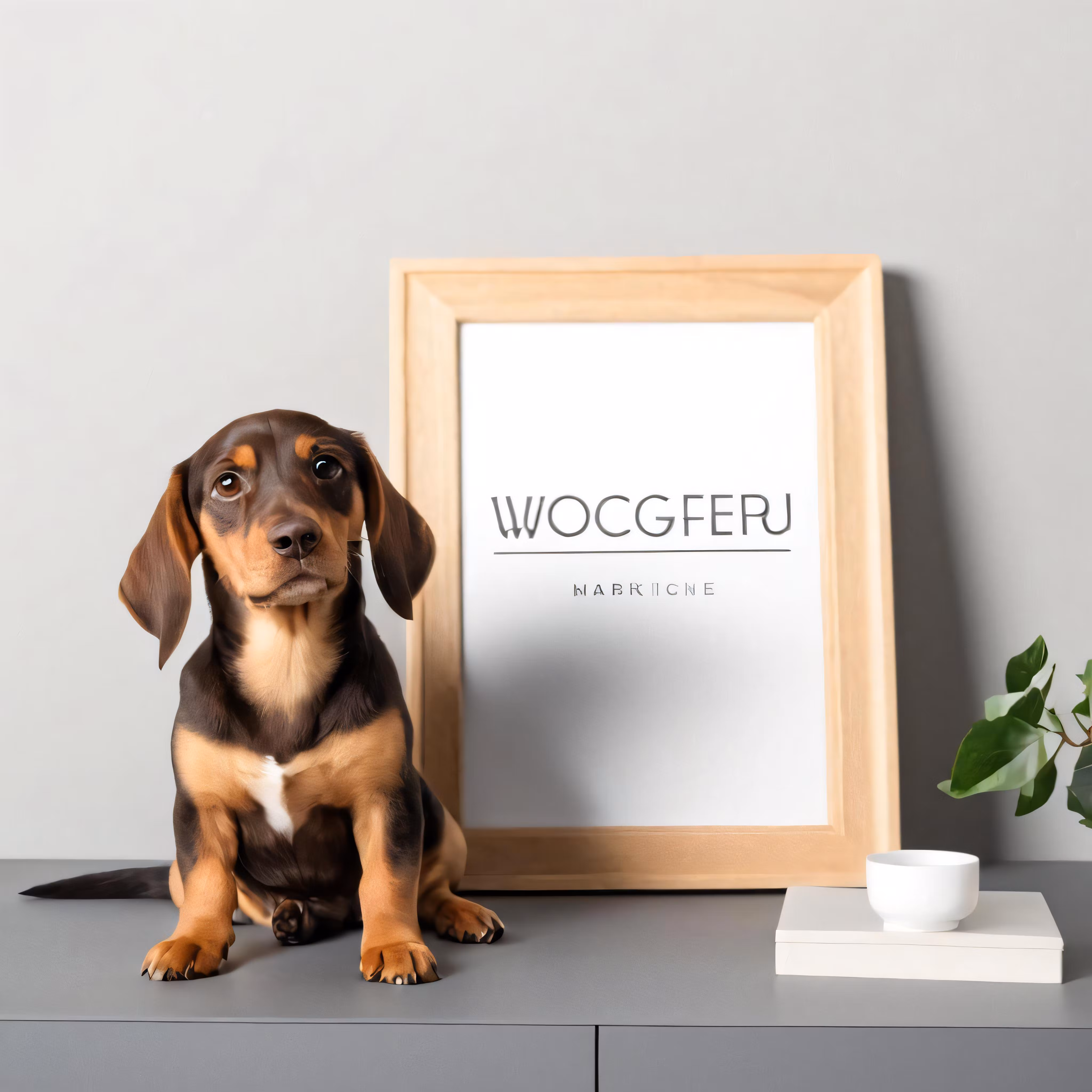High resolution picture, free to use, a dog on a desk next to a framed photo