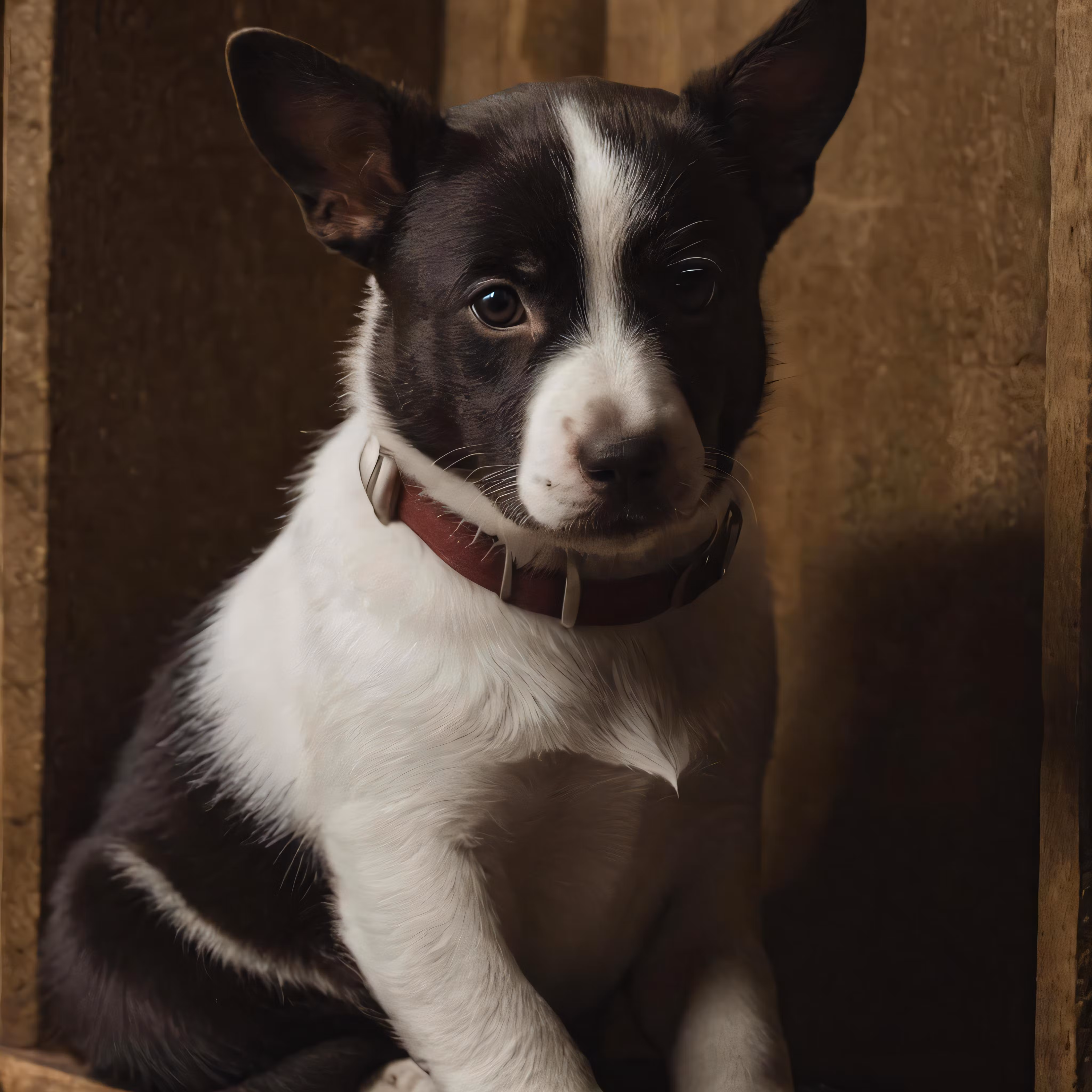 High resolution picture, free to use, a dog sits on the floor, wearing a collar
