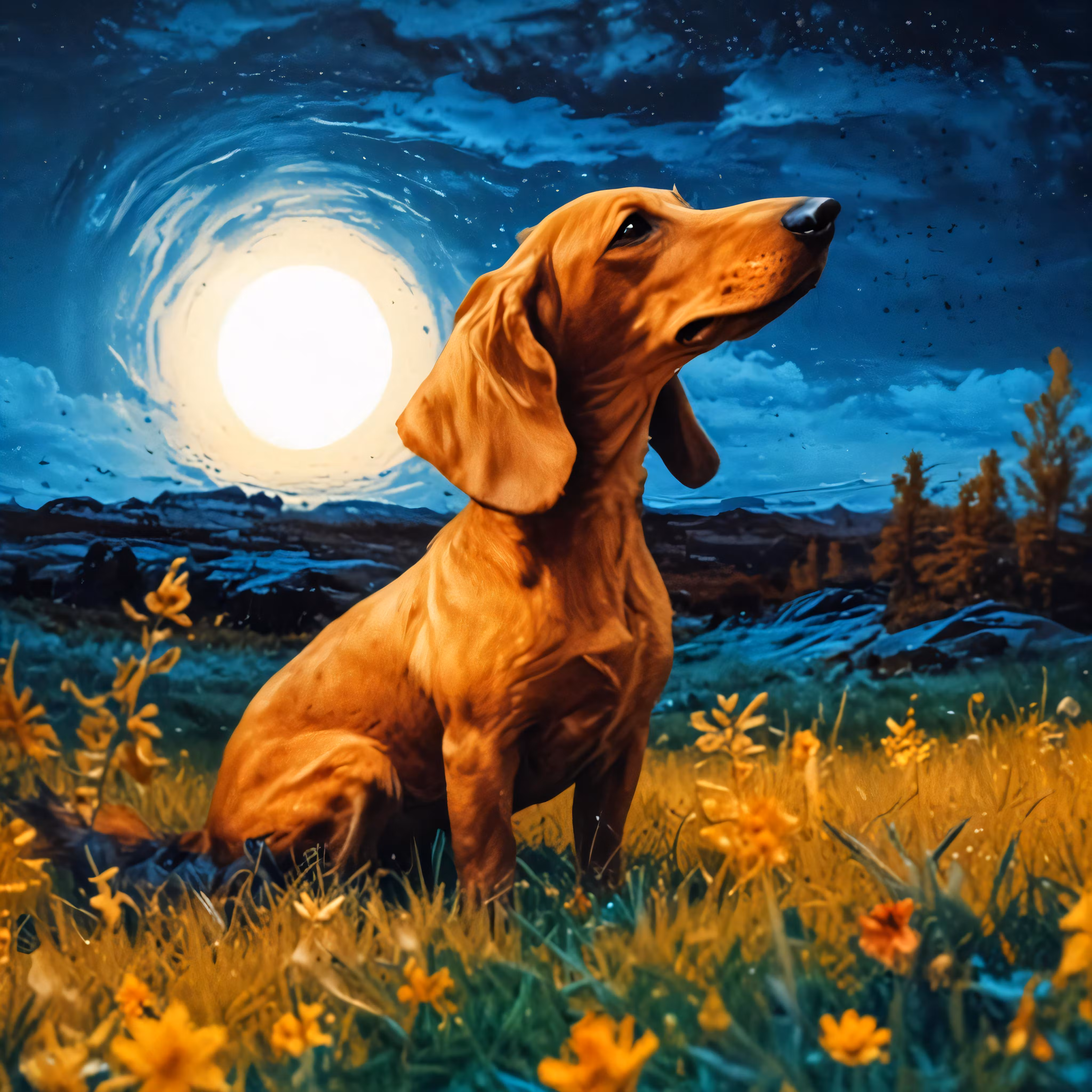 High resolution picture, free to use, a dog sitting on a grassy field next to the moon