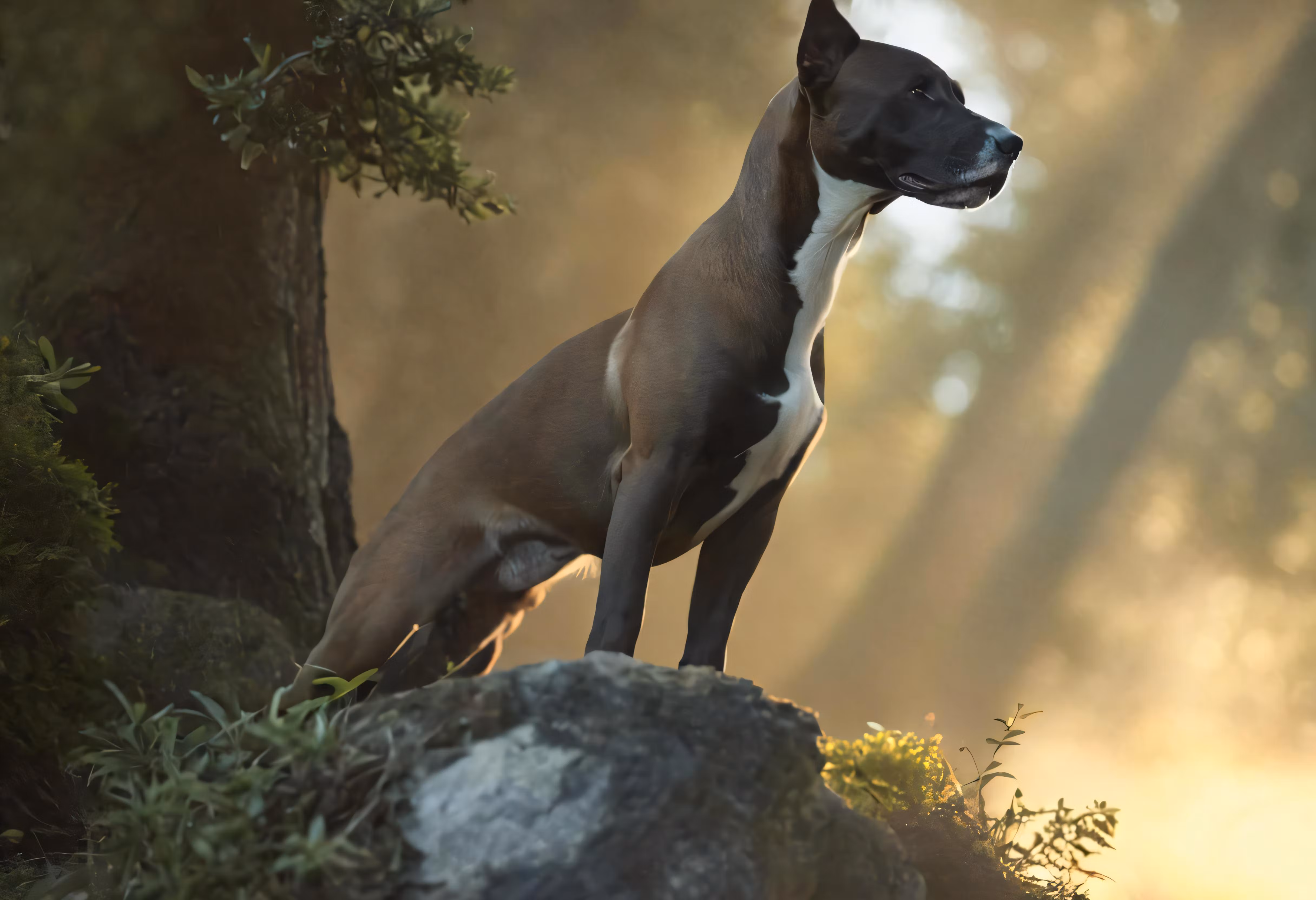 High resolution picture, free to use, a dog stands on some rocks in the woods