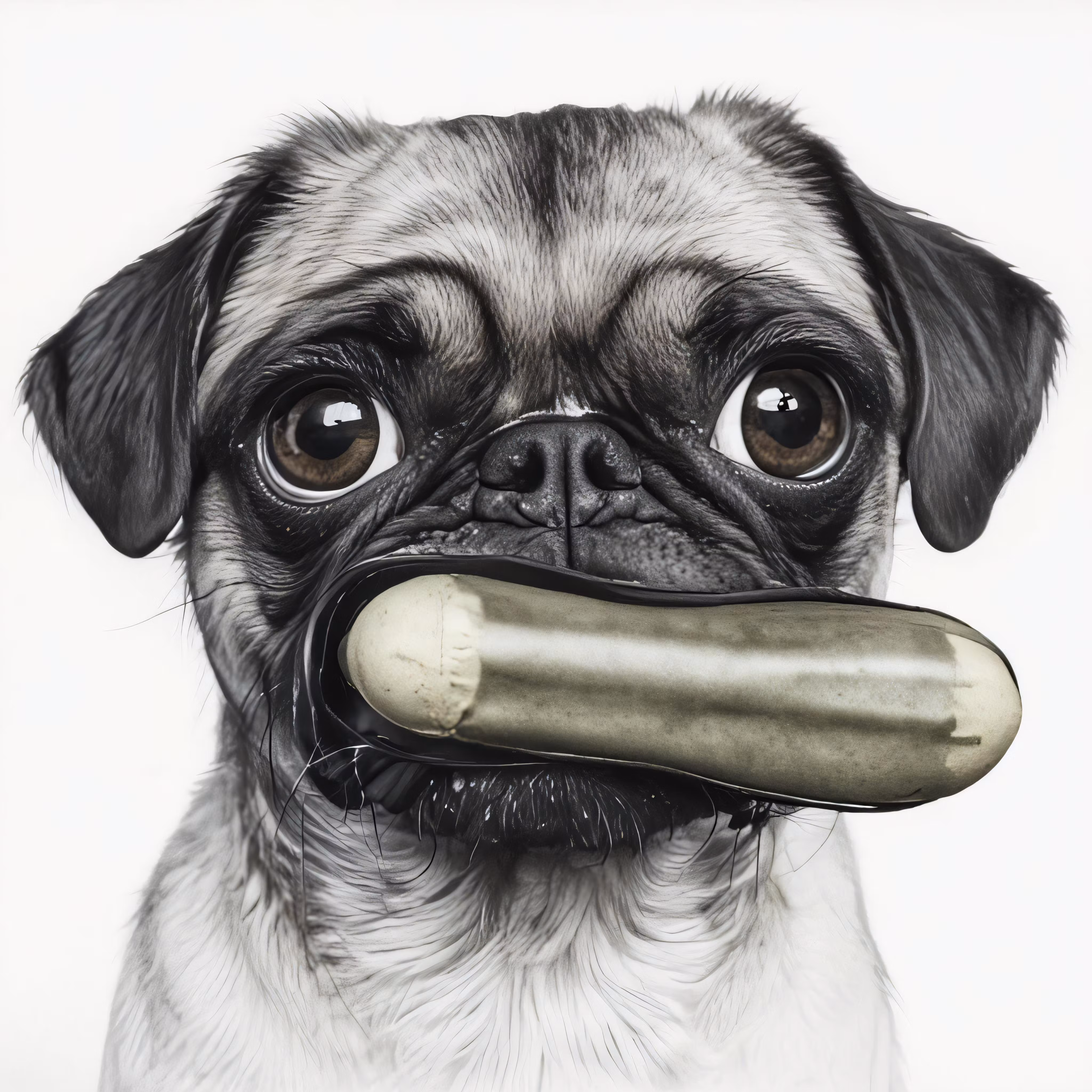 High resolution picture, free to use, a dog that is holding a sausage in his mouth