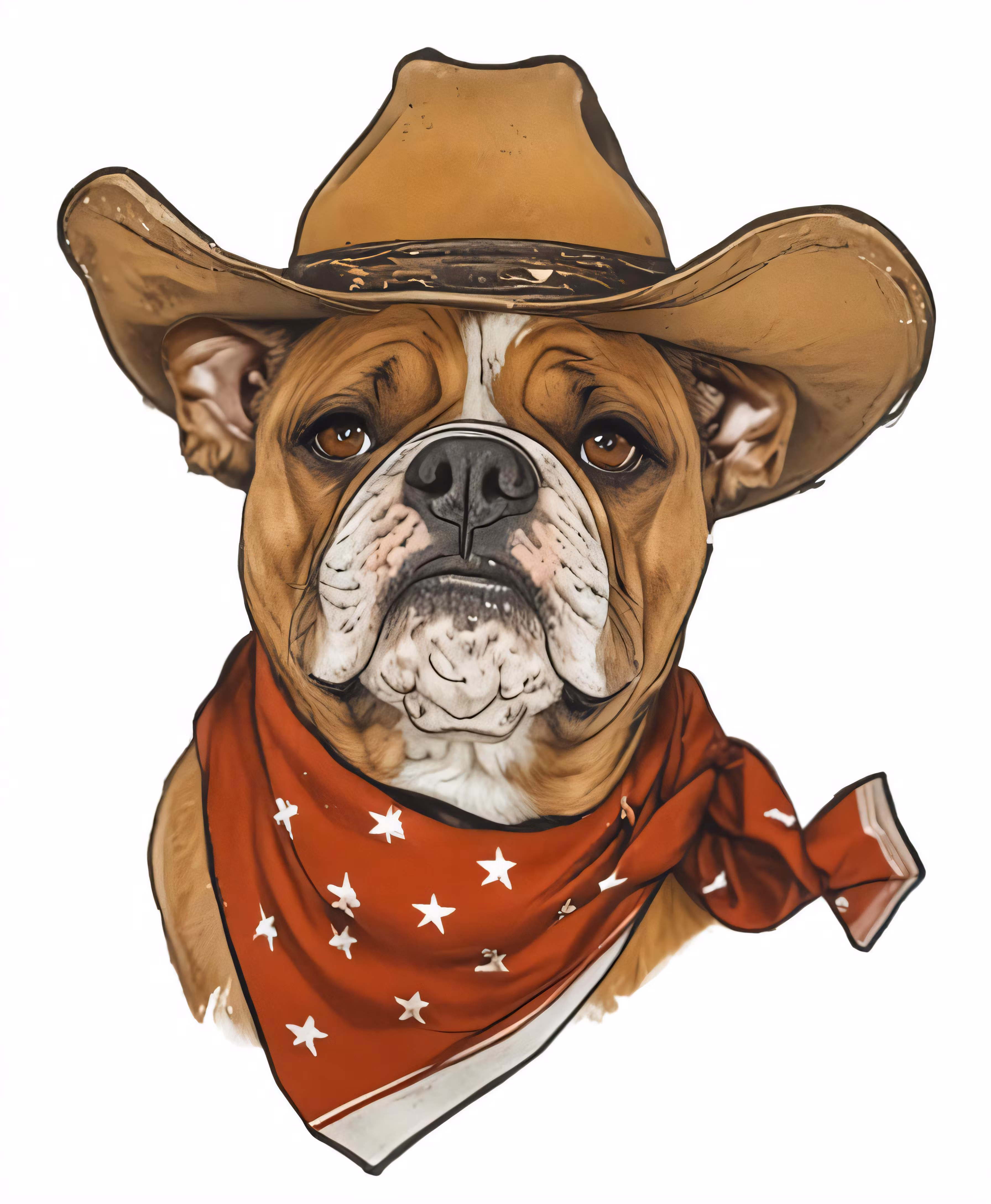 High resolution picture, free to use, a dog wearing a cowboy hat and bandana