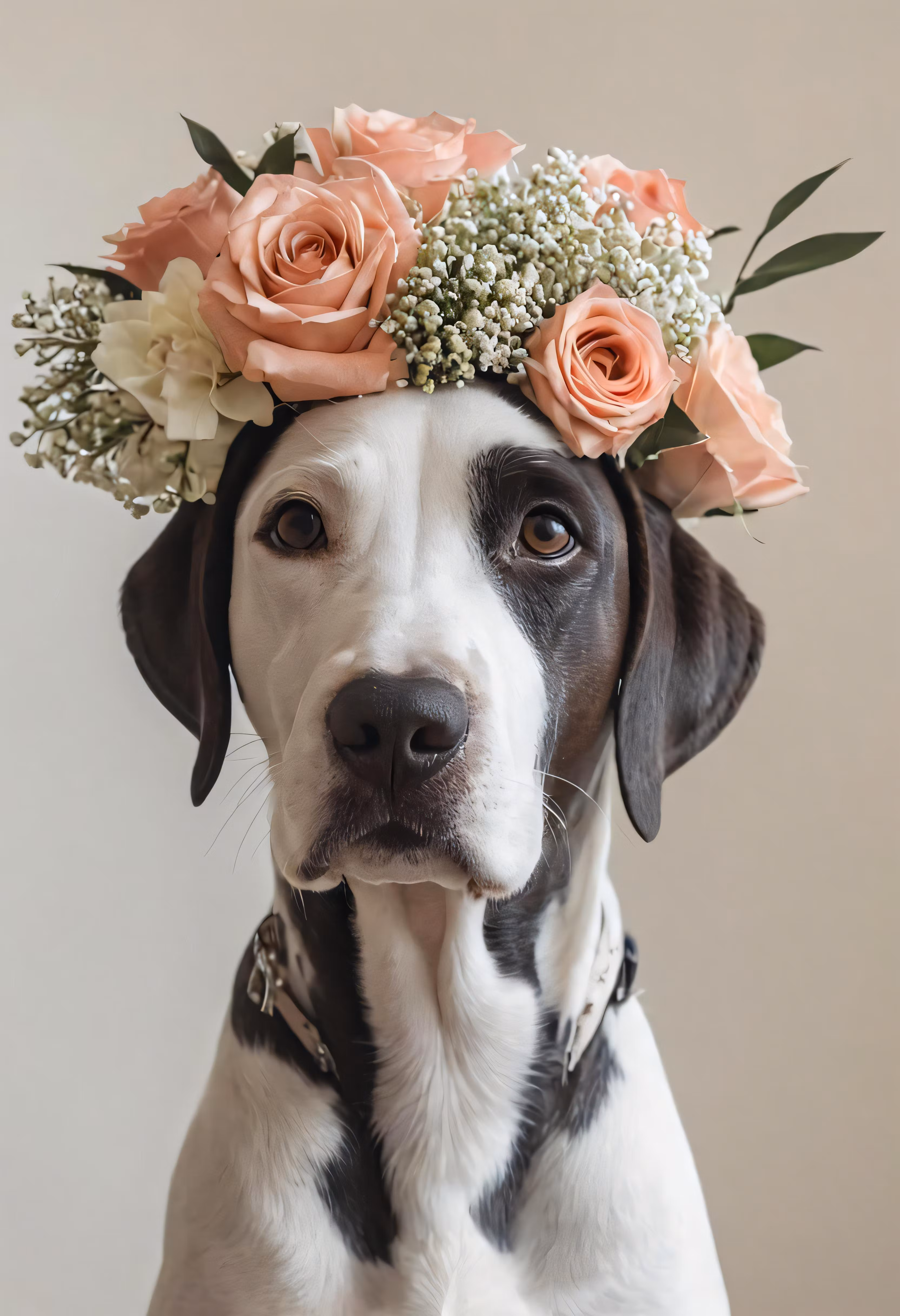 High resolution picture, free to use, a dog wearing a floral crown with roses