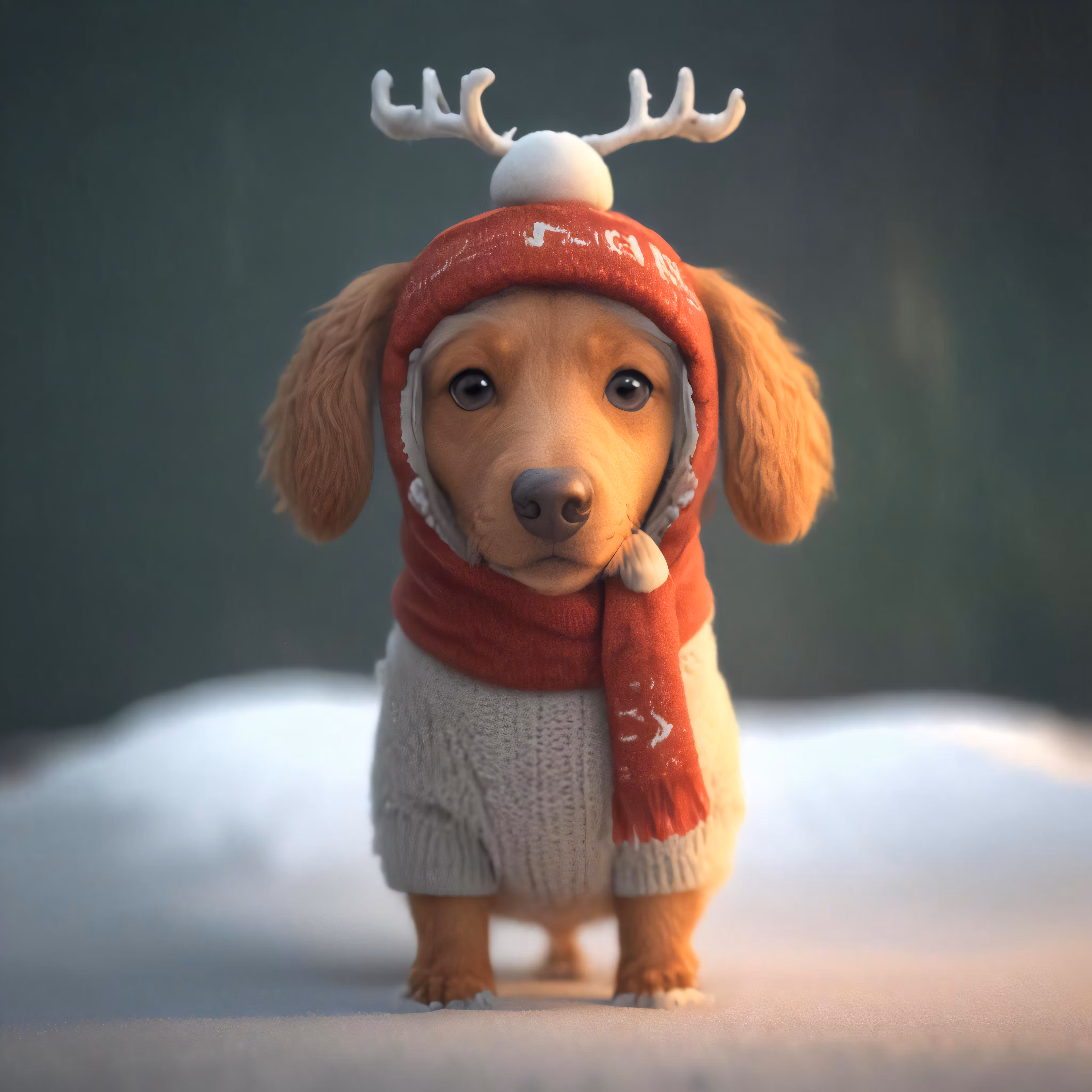 High resolution picture, free to use, a dog wearing a sweater and a scarf while standing in the snow