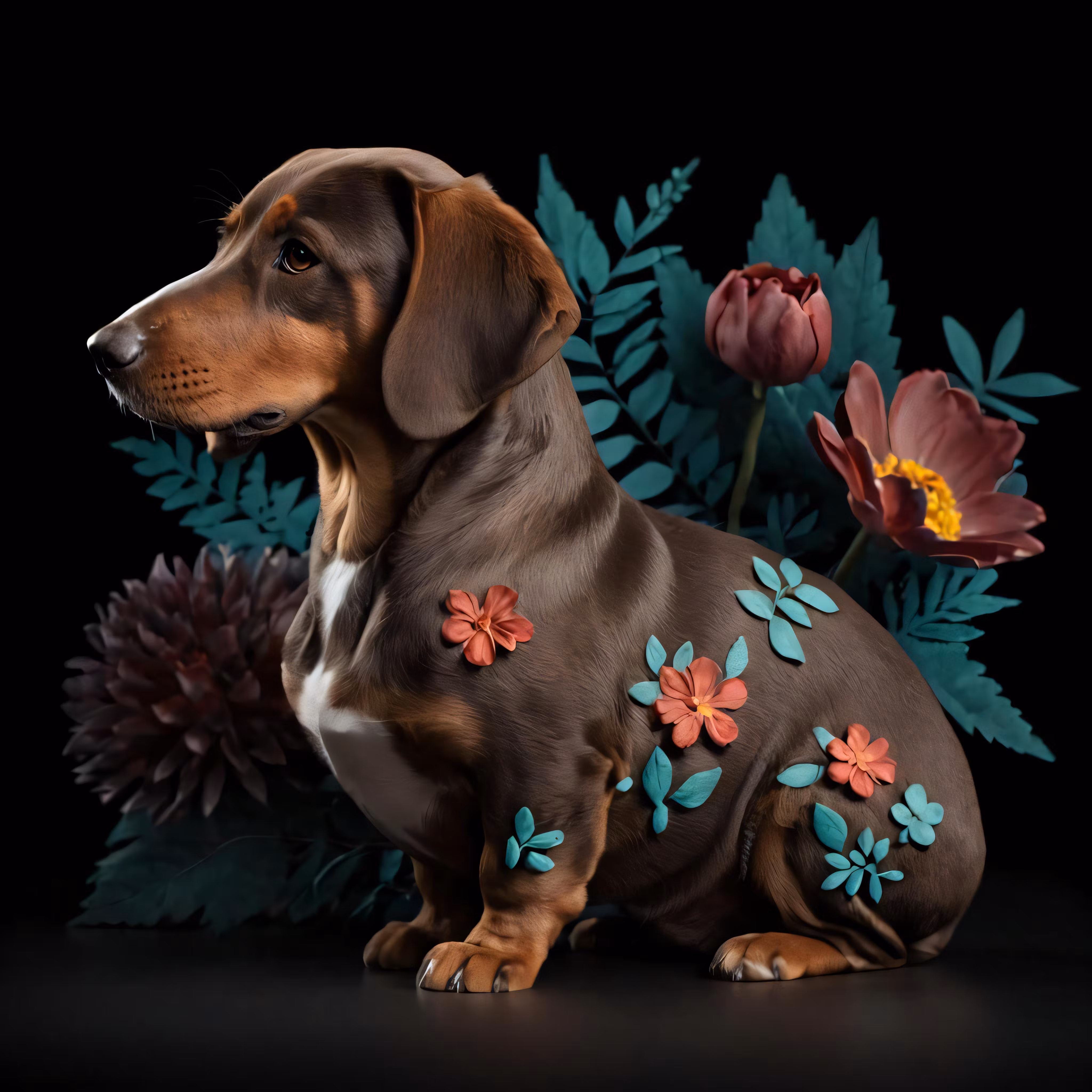 High resolution picture, free to use, a dog with a floral design on it sits near flowers