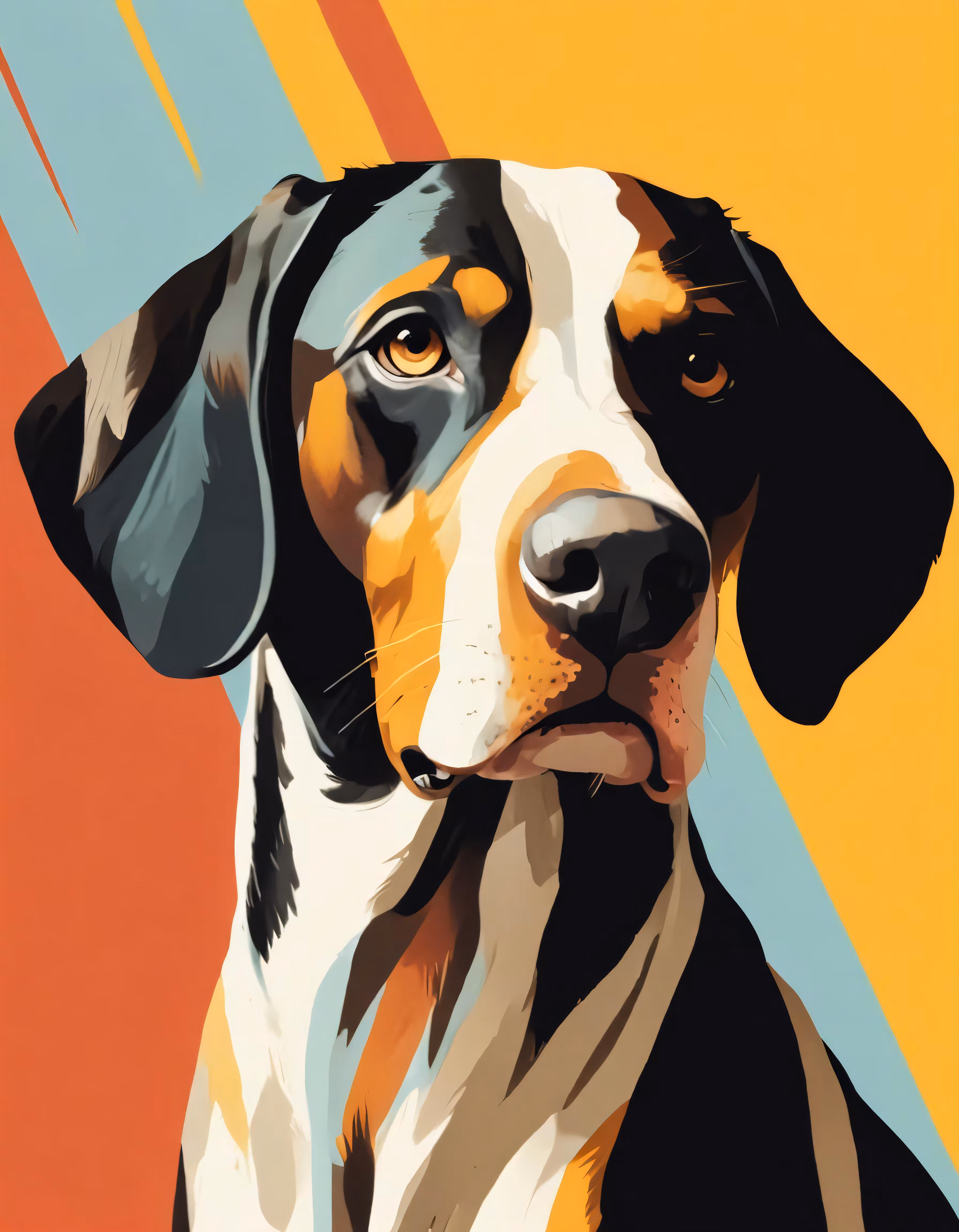 High resolution picture, free to use, a dog with black, white and brown spots in a blue, yellow, orange, and green background