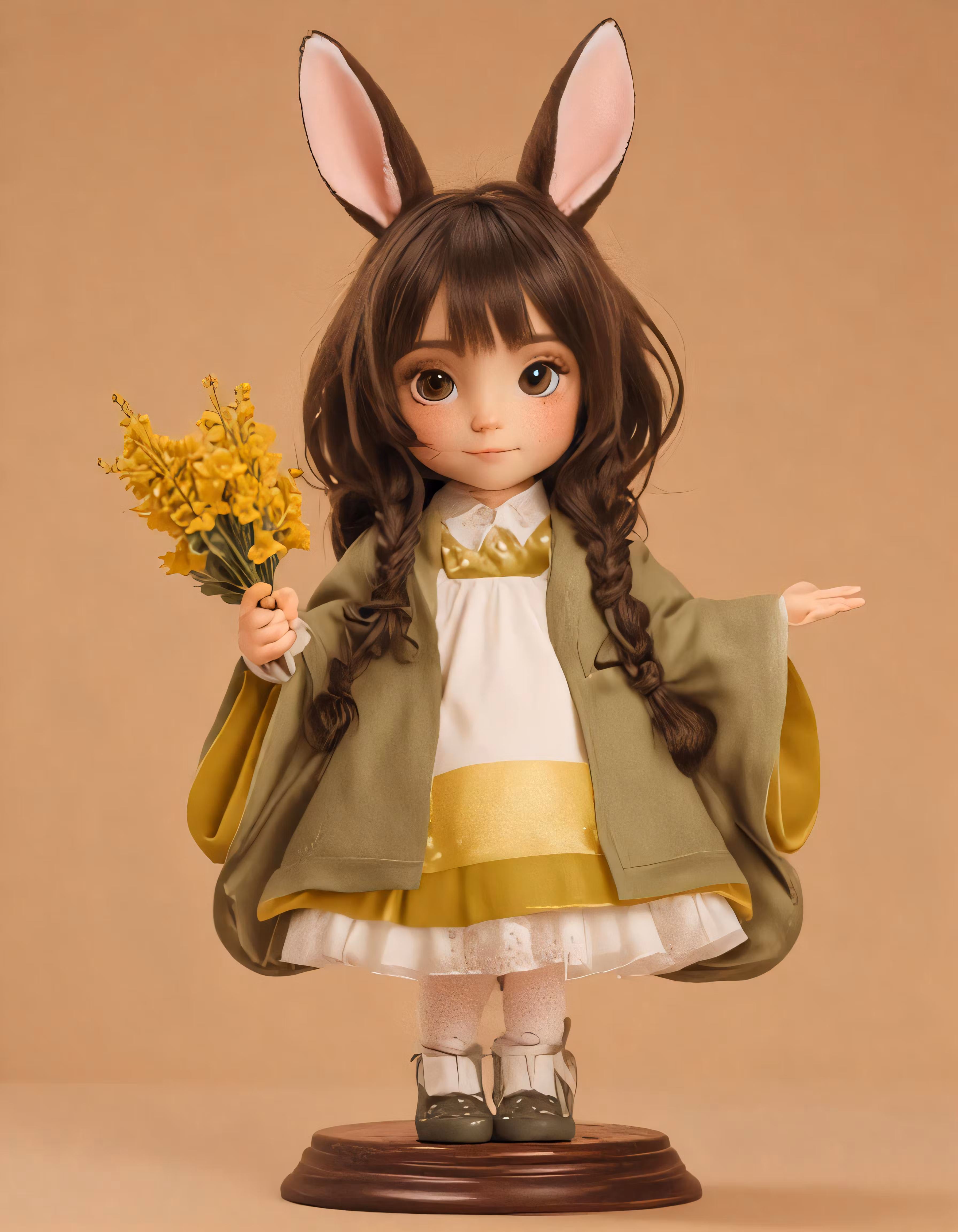 High resolution picture, free to use, a doll dressed in easter clothes and bunny ears with a bouquet of flowers