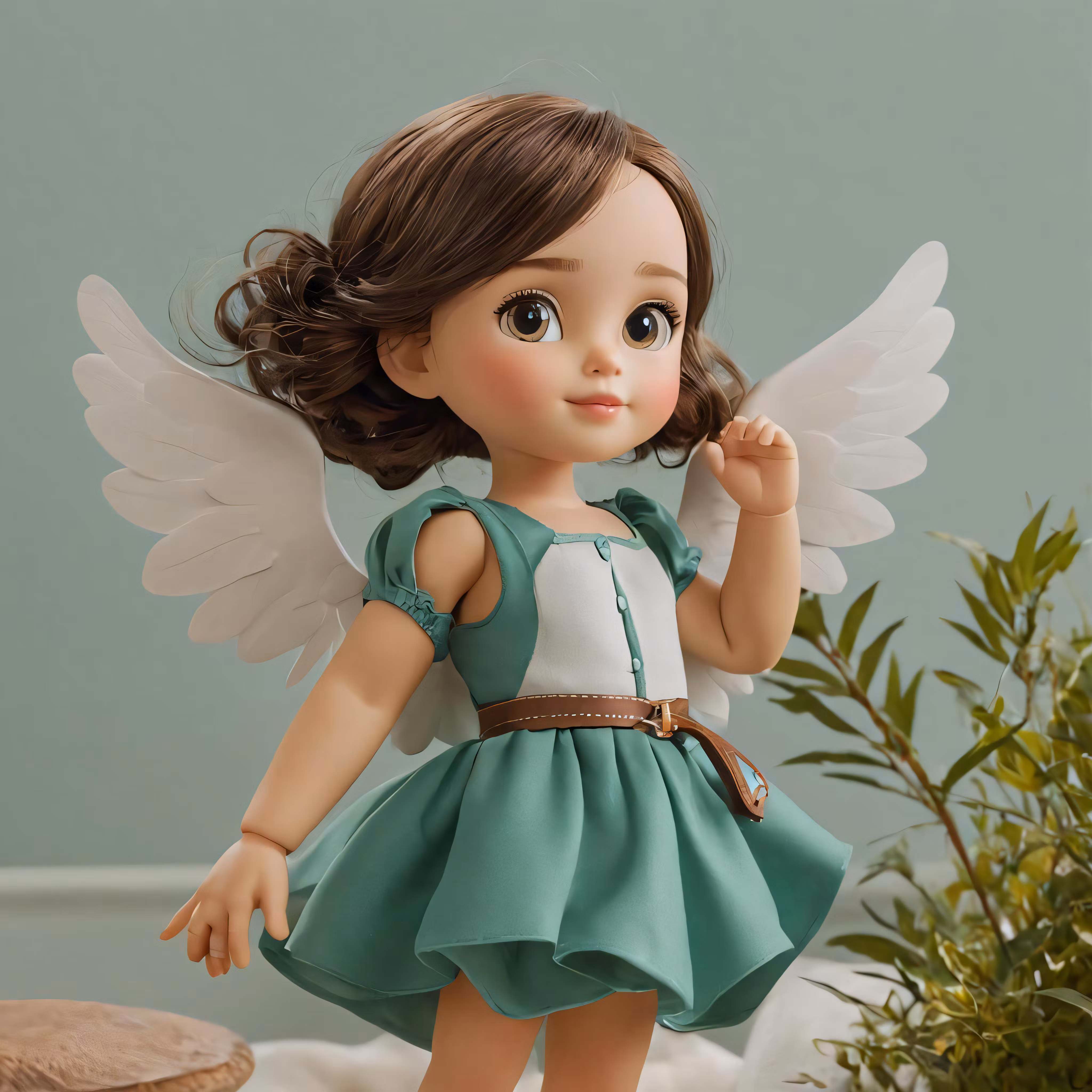 High resolution picture, free to use, a doll with an angelic green dress is on a white counter