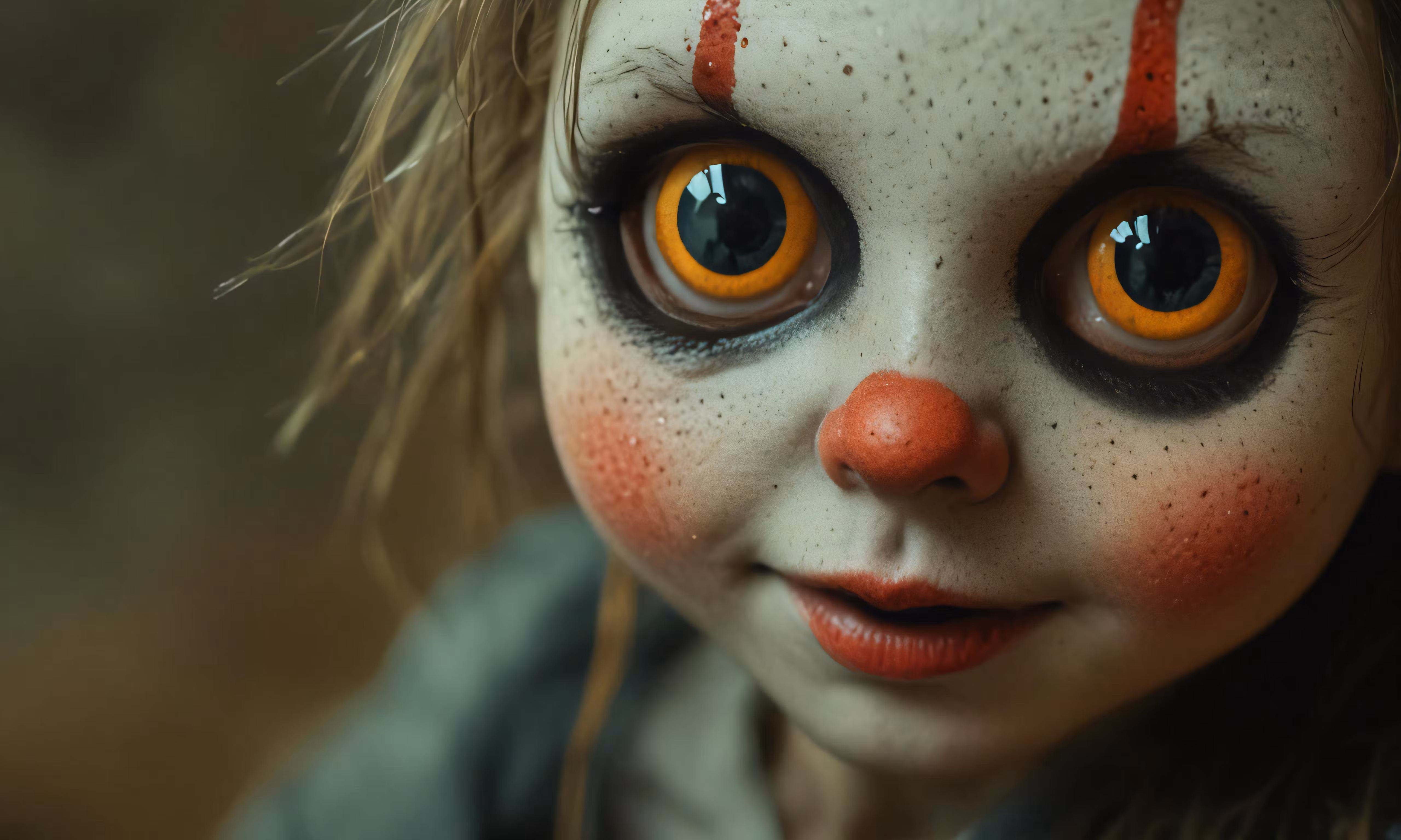 High resolution picture, free to use, a doll with big orange eyes is dressed like a clown