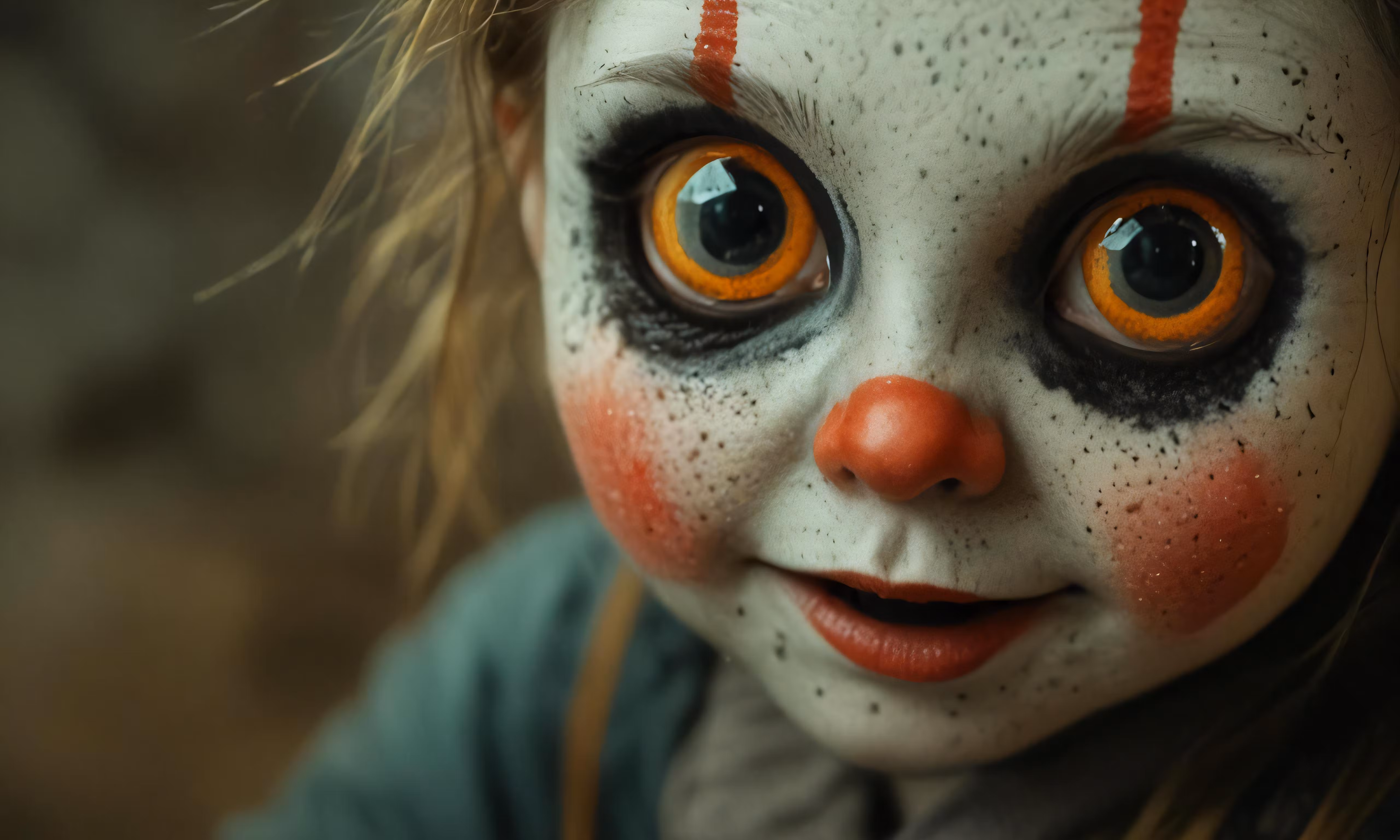 High resolution picture, free to use, a doll with clown make up is looking at the camera