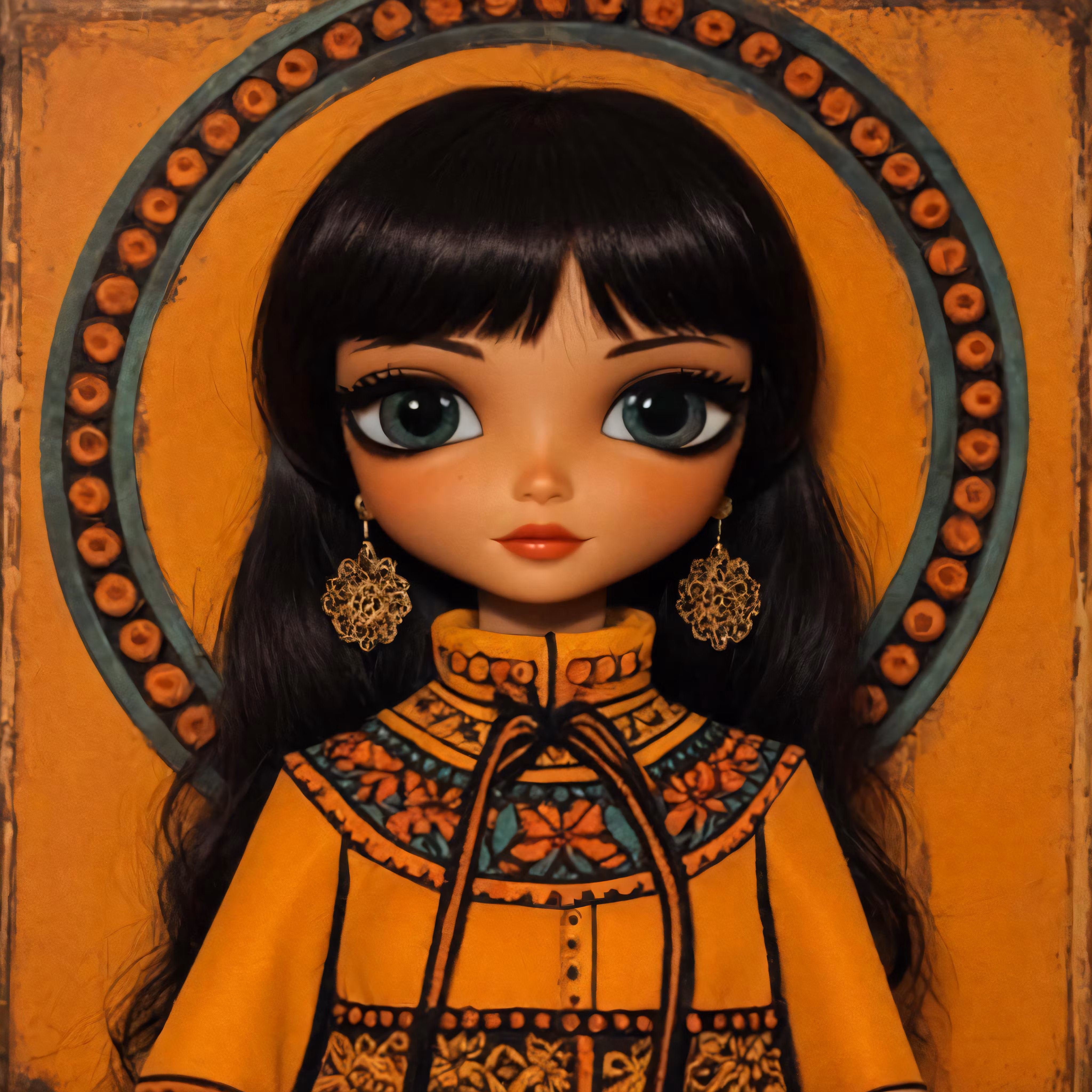 High resolution picture, free to use, a dolls doll wearing ear rings with a patterned dress on