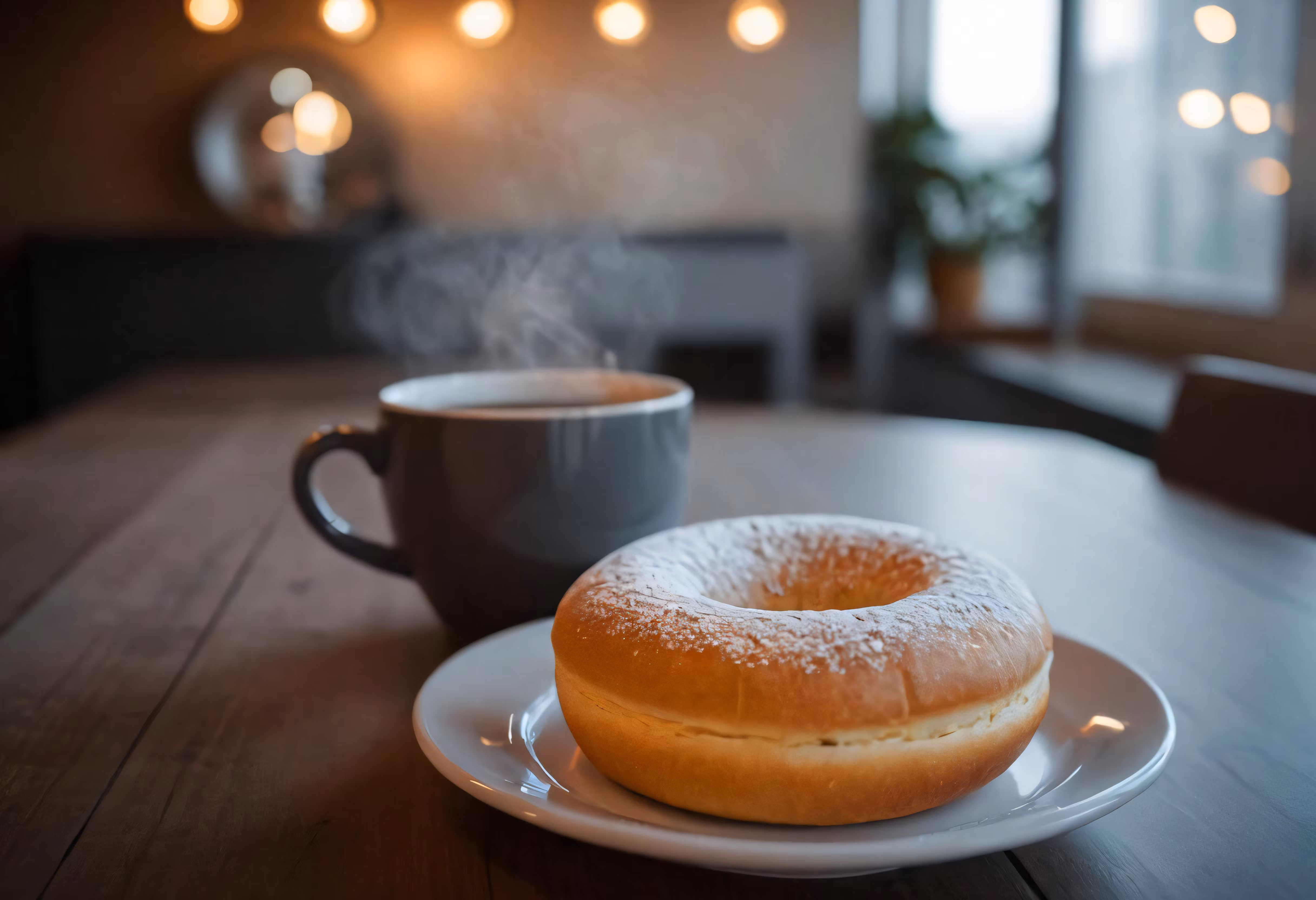 High resolution picture, free to use, a donut on a plate sitting on top of a wooden table