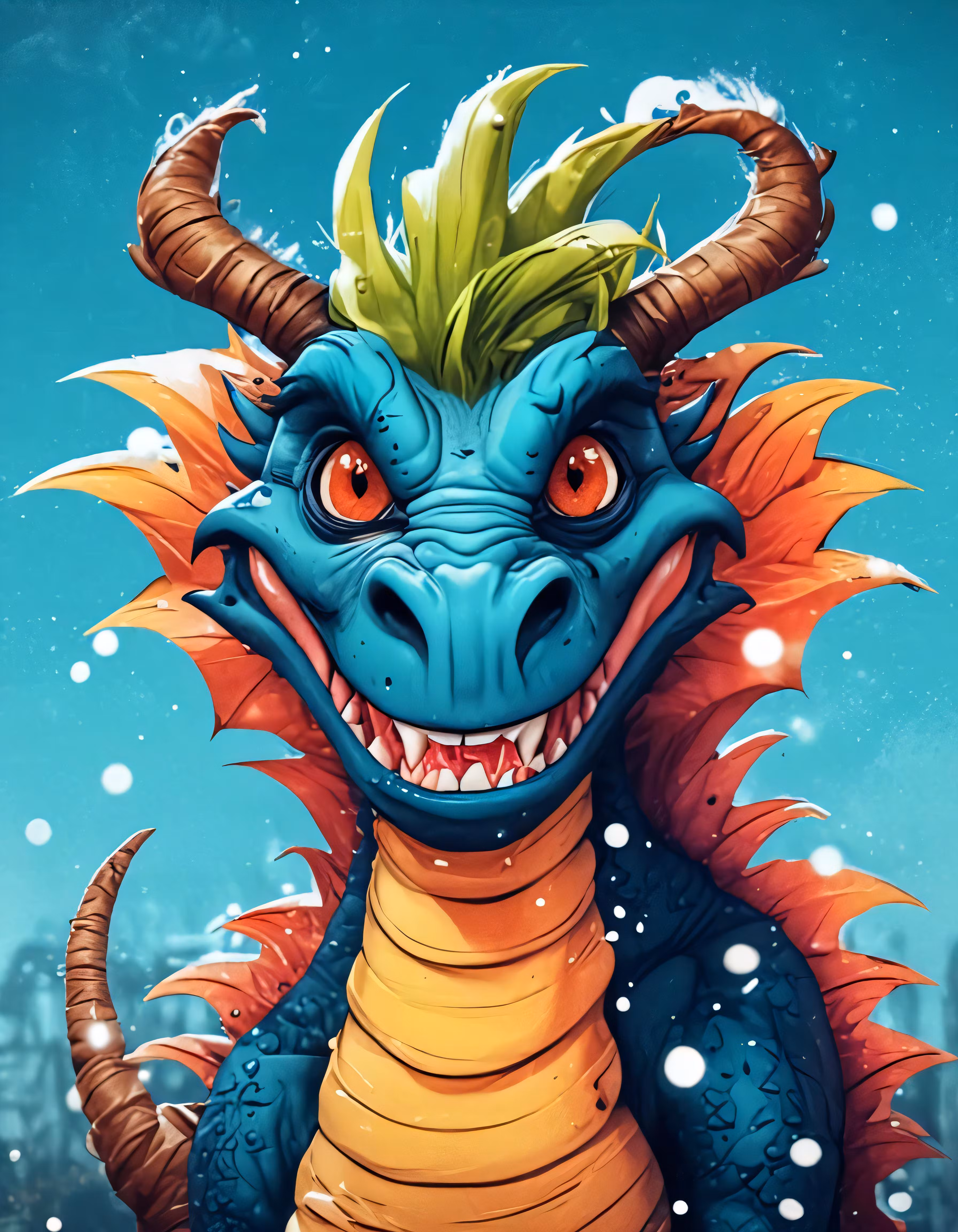 High resolution picture, free to use, a dragon with big horns is standing in the snow