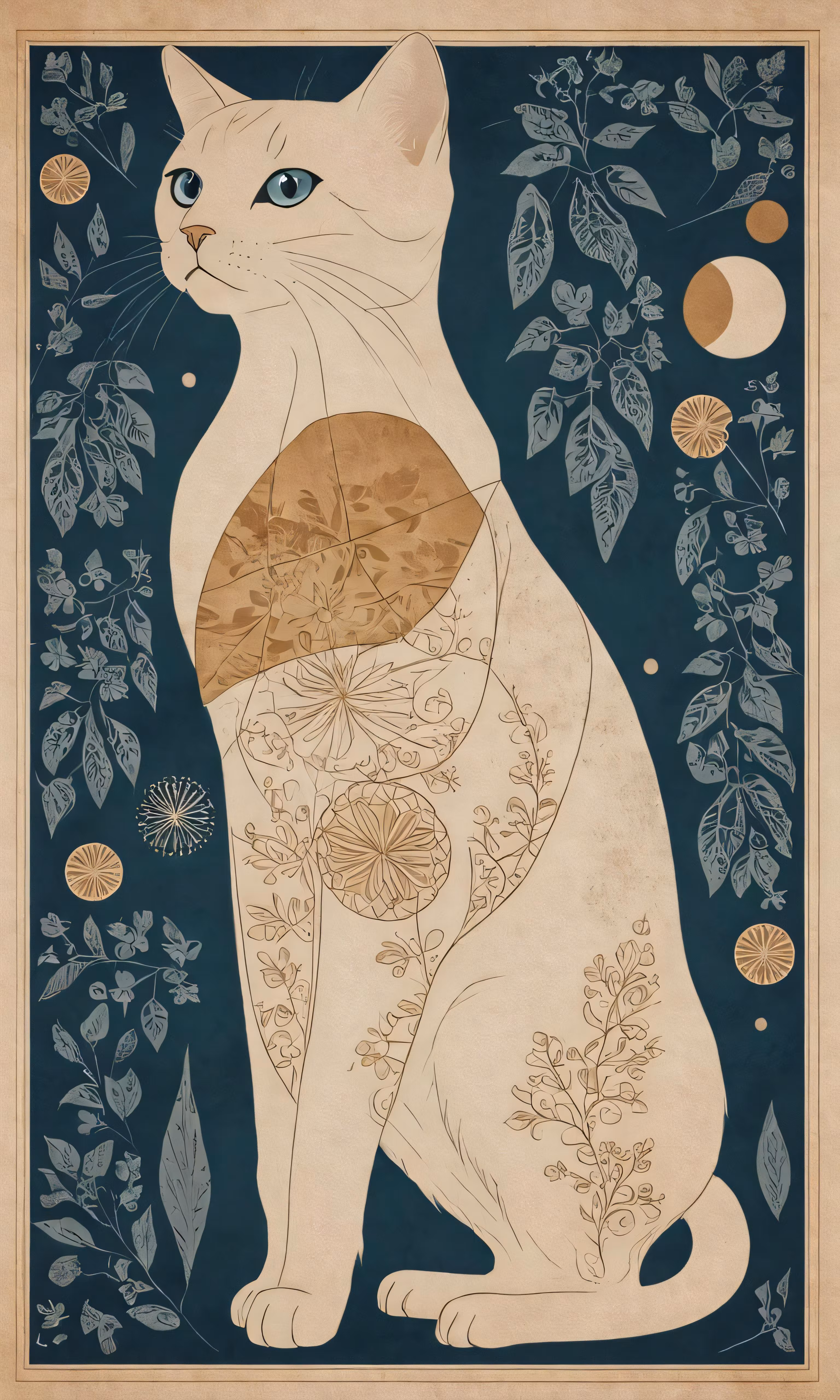 High resolution picture, free to use, a drawing of a cat with leaves and flowers in it