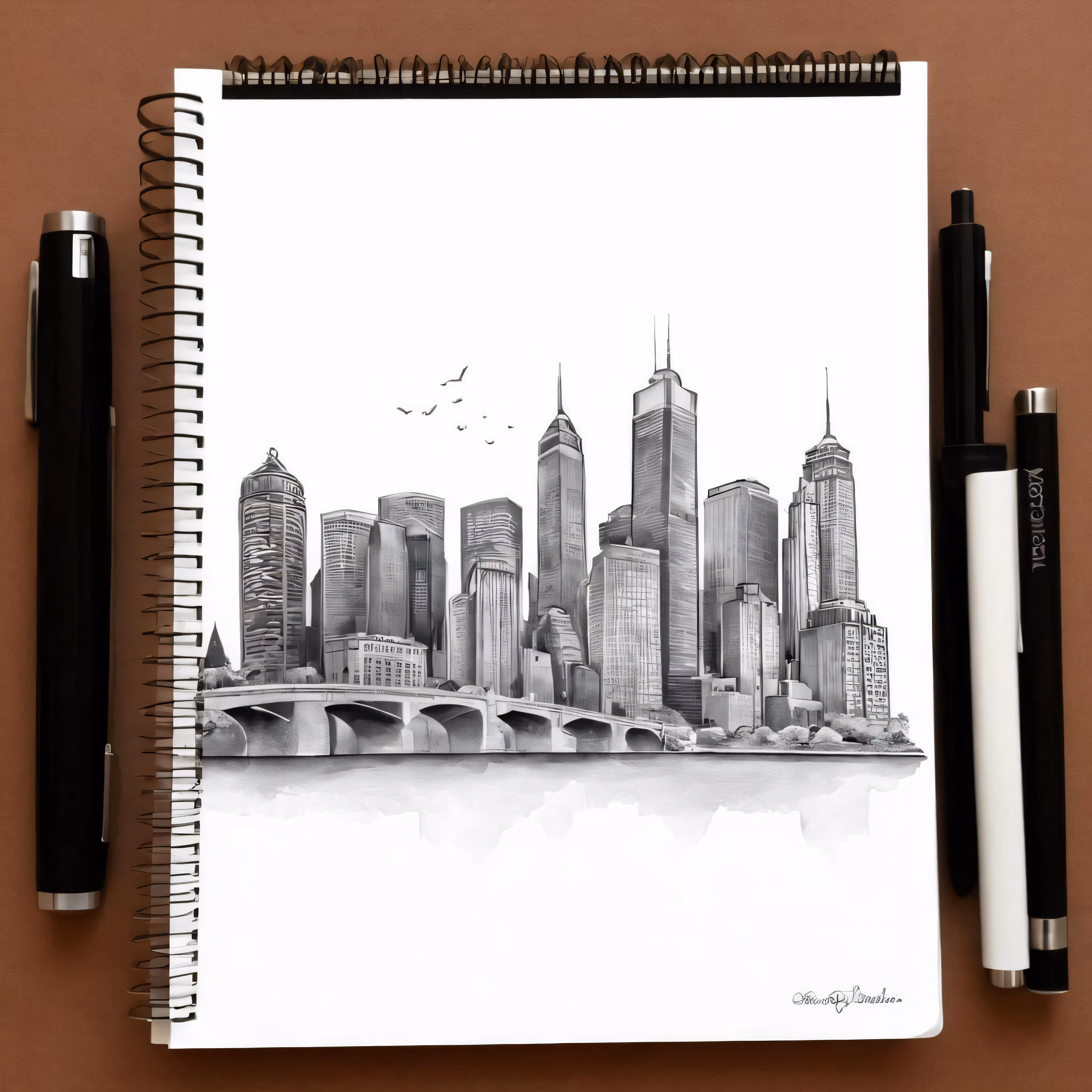 High resolution picture, free to use, a drawing of a city skyline on a note book