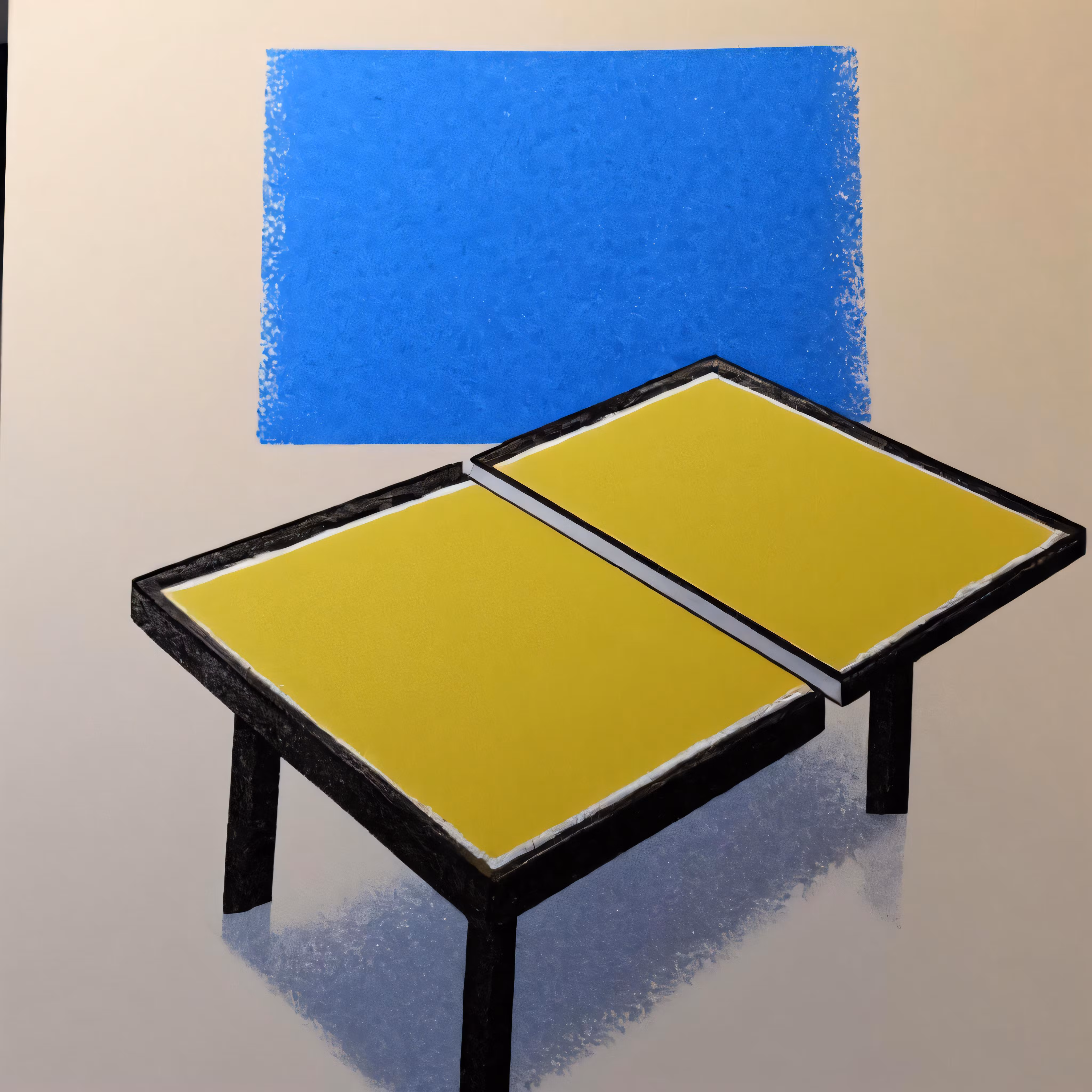 High resolution picture, free to use, a drawing of a coffee table with blue and yellow painted on it