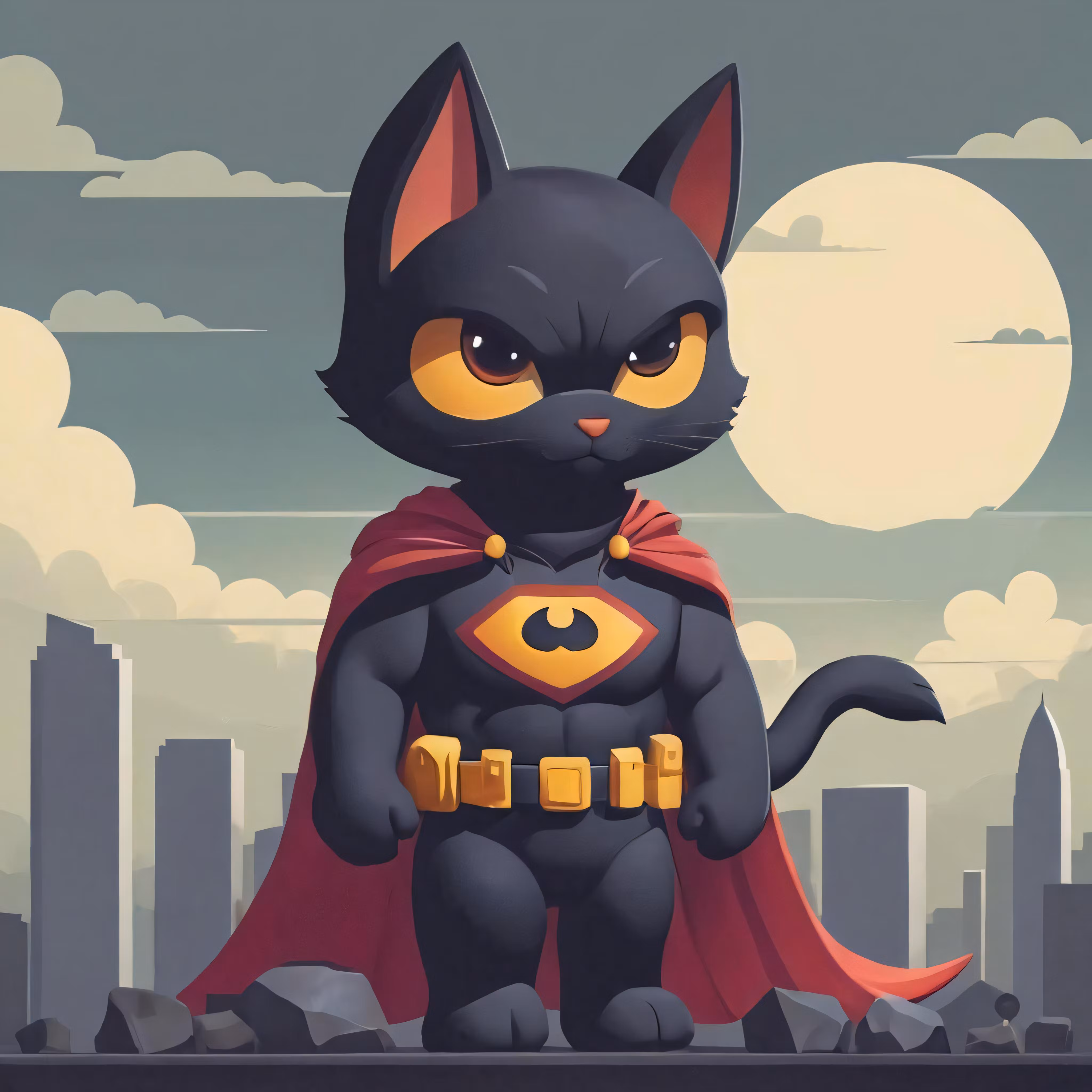 High resolution picture, free to use, a drawing of a cute cat wearing a batman costume