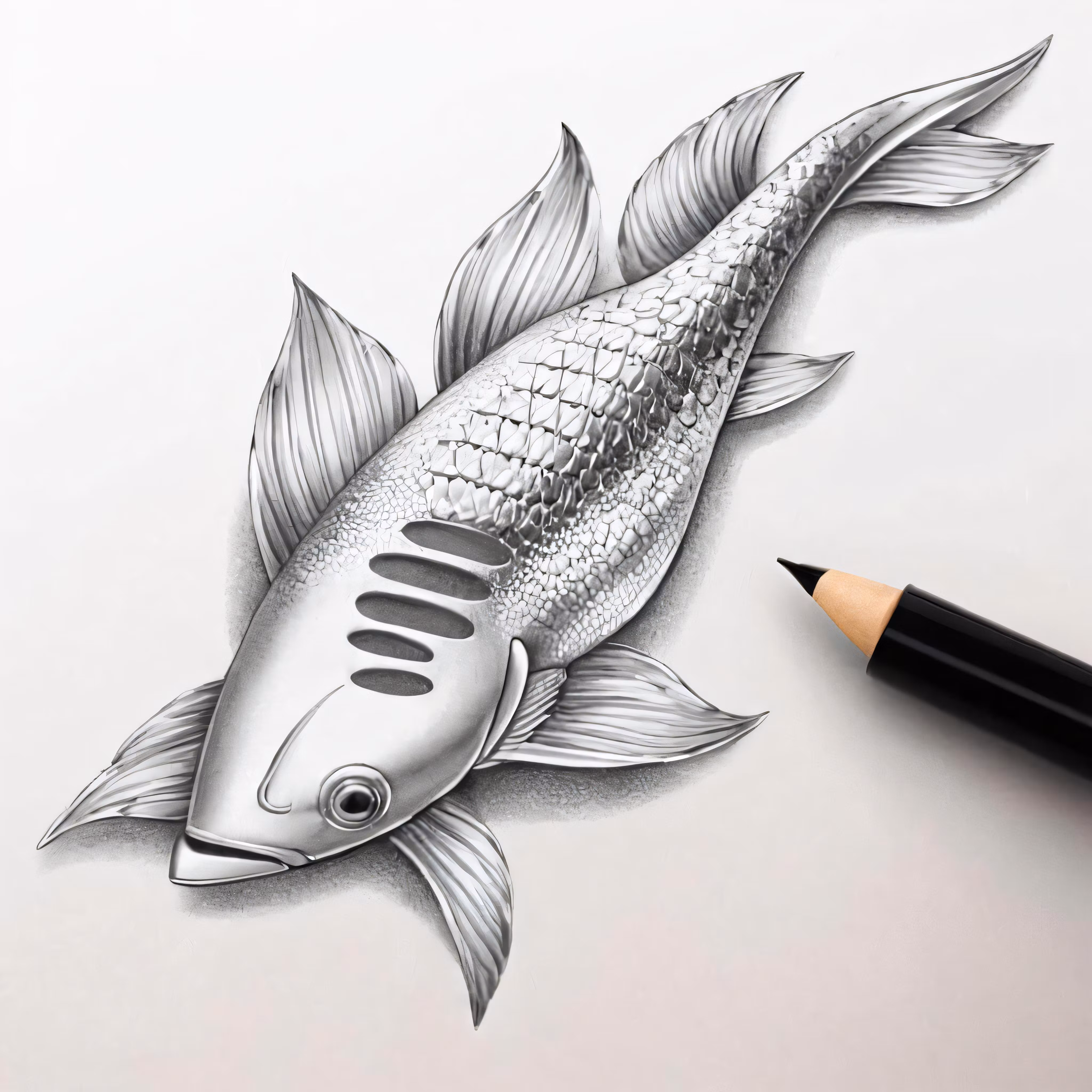 High resolution picture, free to use, a drawing of a fish with a pencil in it