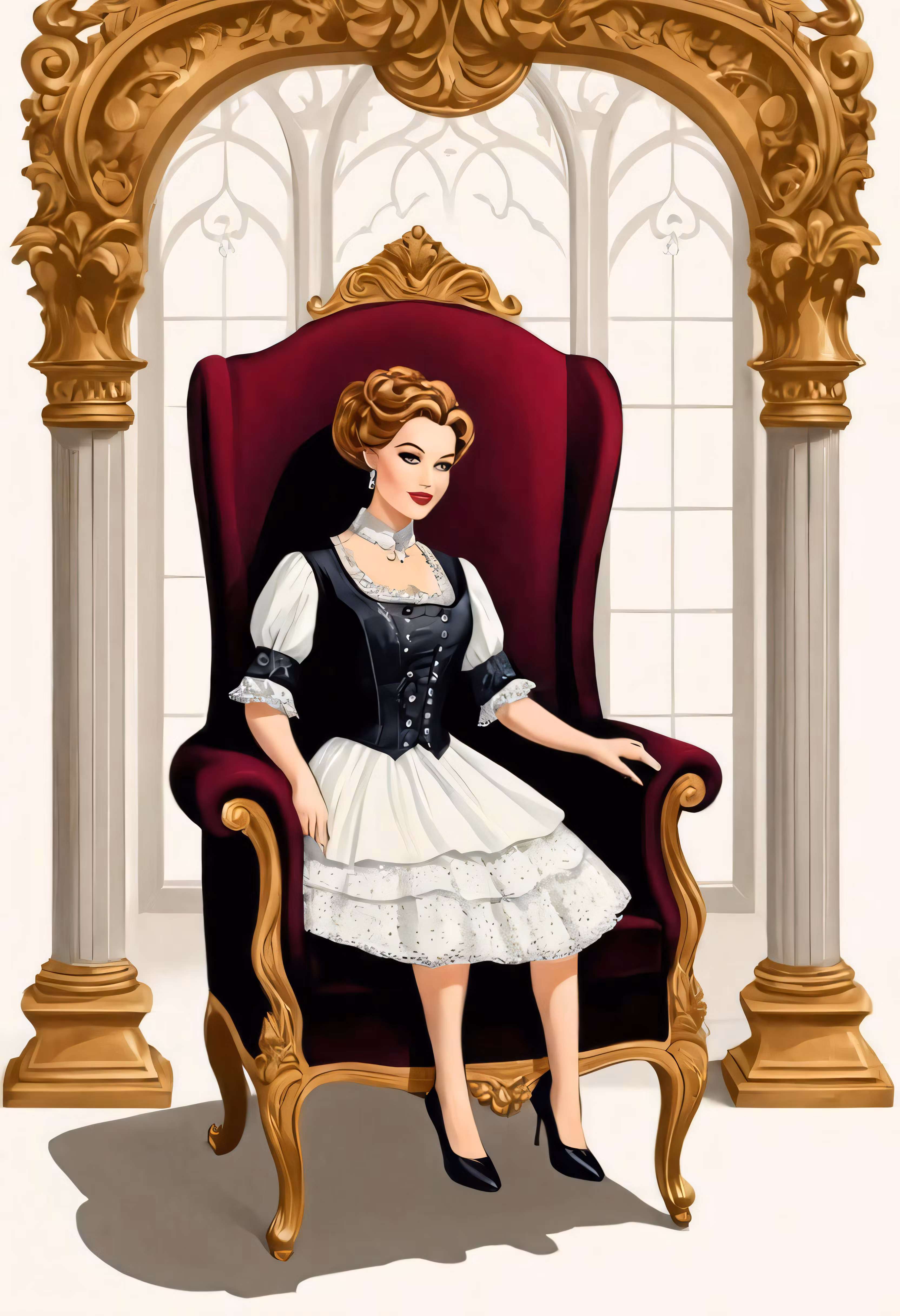 High resolution picture, free to use, a drawing of a girl in a costume sitting on an ornate chair