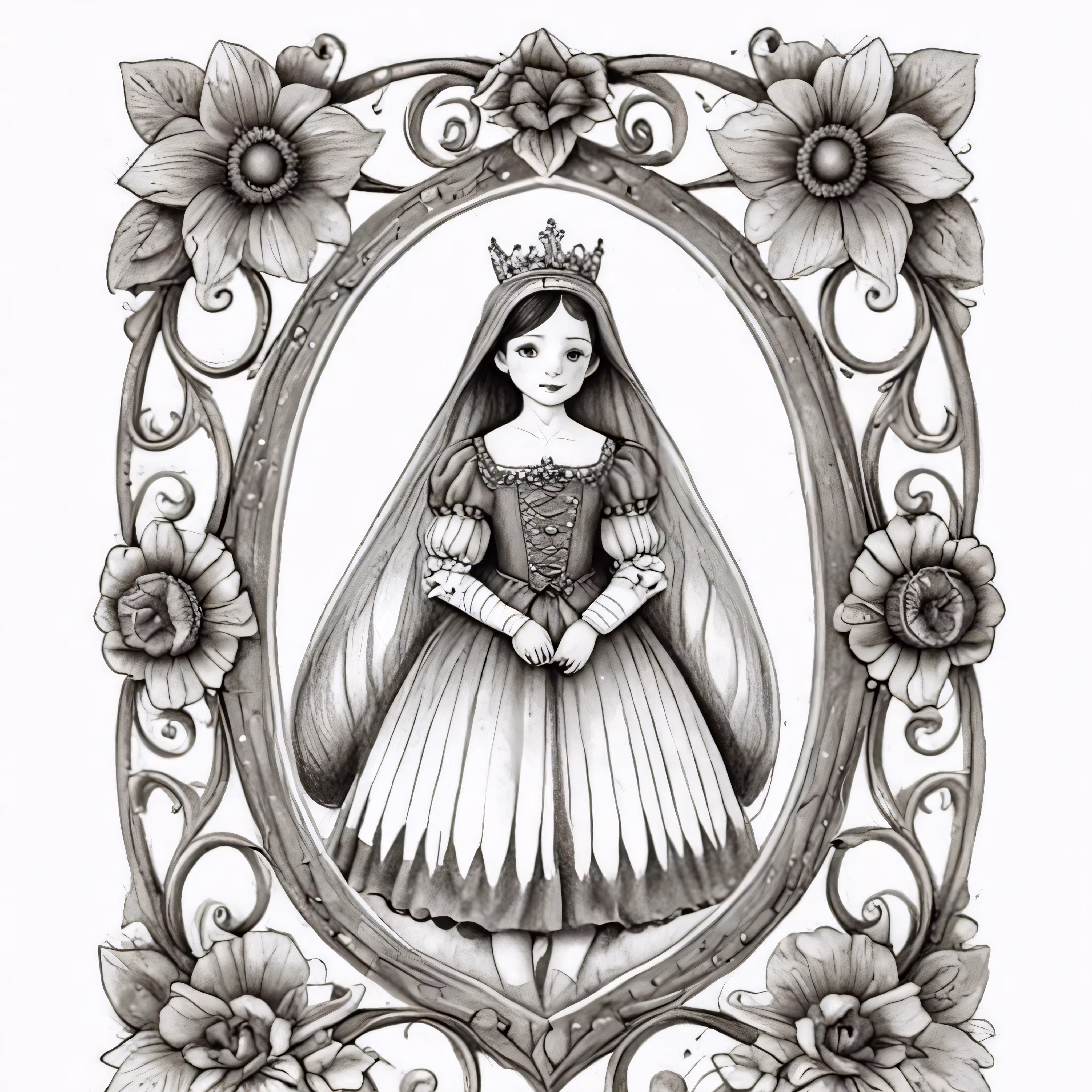 High resolution picture, free to use, a drawing of a girl in a dress with flowers and leaves