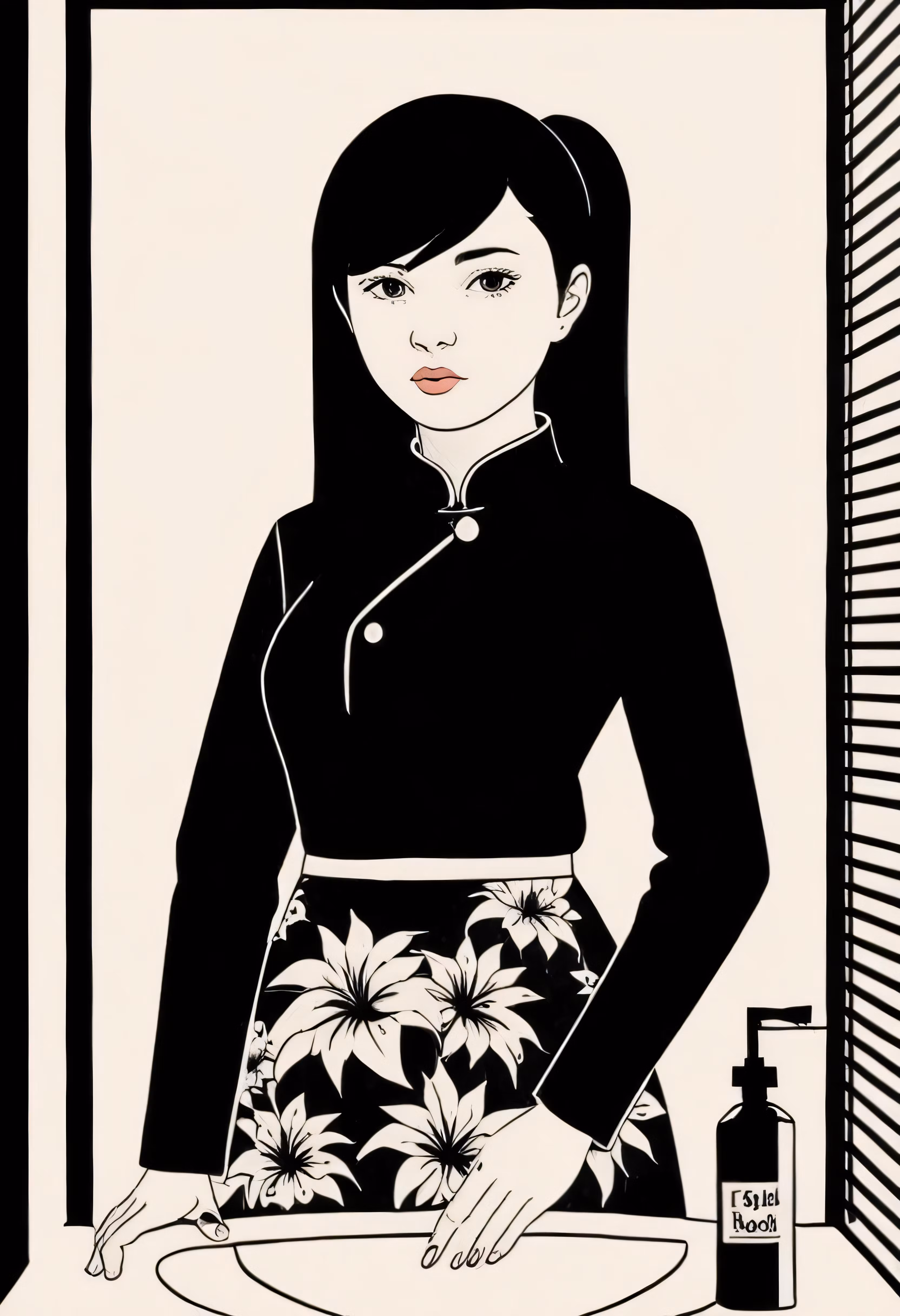 High resolution picture, free to use, a drawing of a girl standing next to a sink