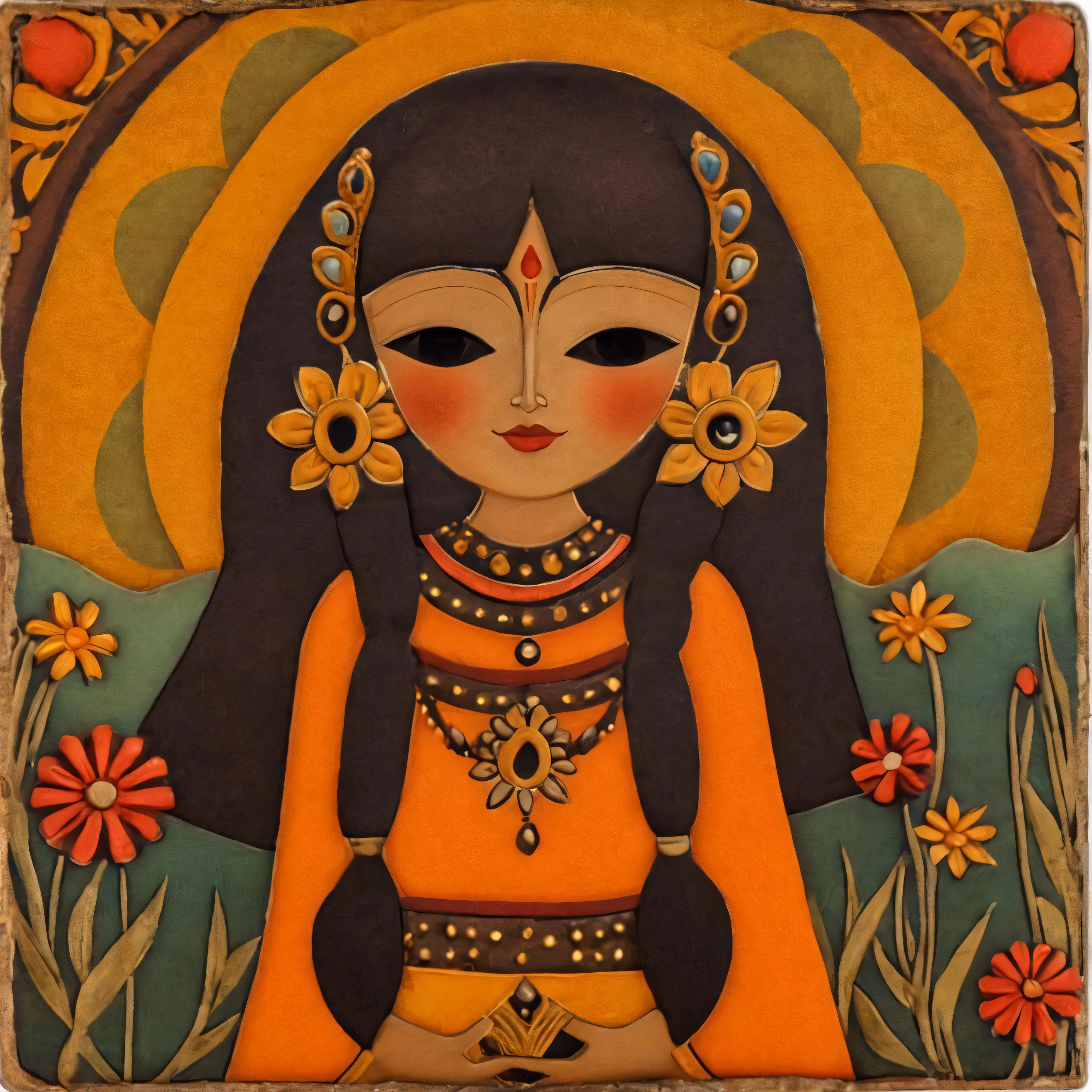 High resolution picture, free to use, a drawing of a girl wearing an orange and black outfit