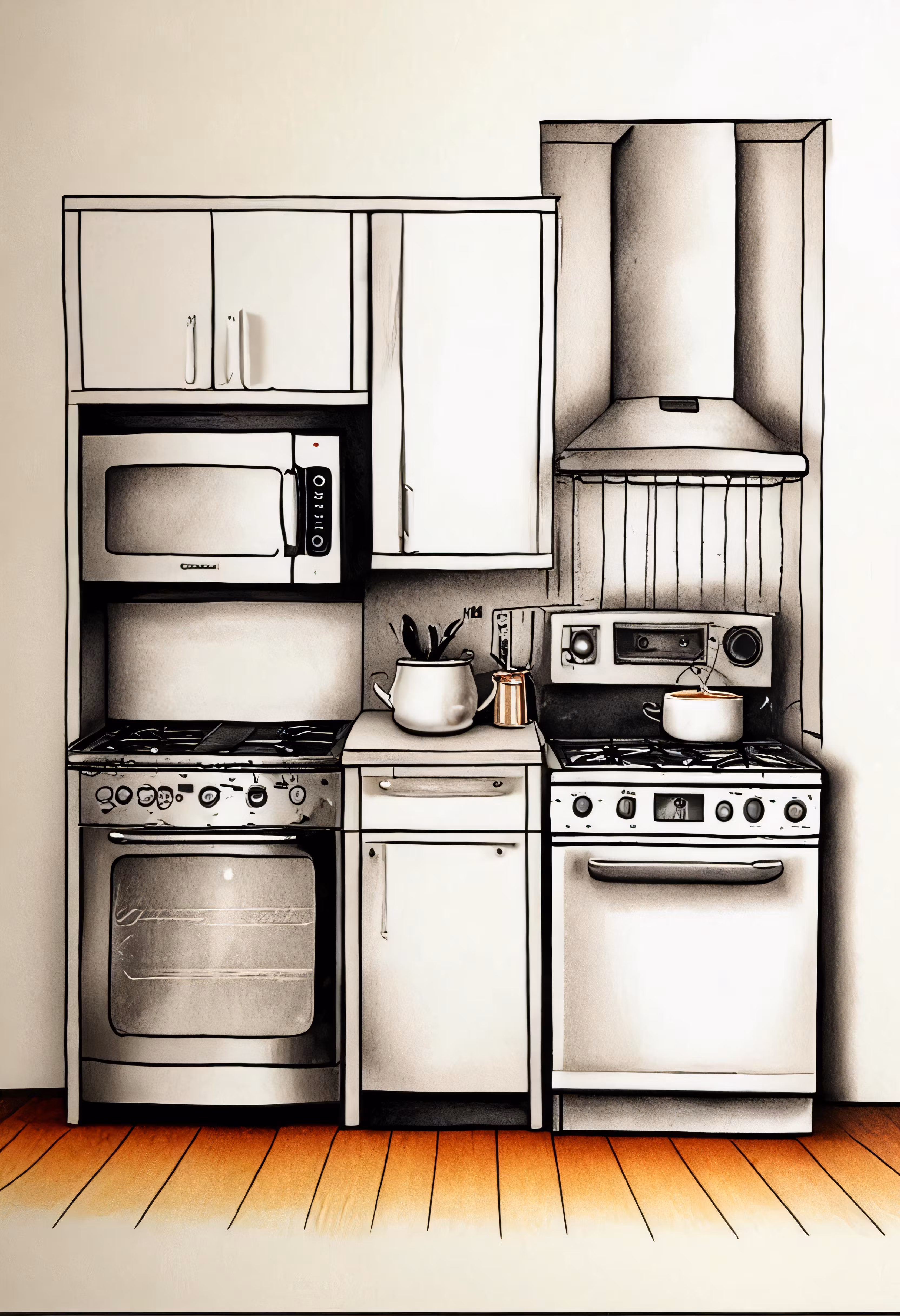 High resolution picture, free to use, a drawing of a kitchen showing the range
