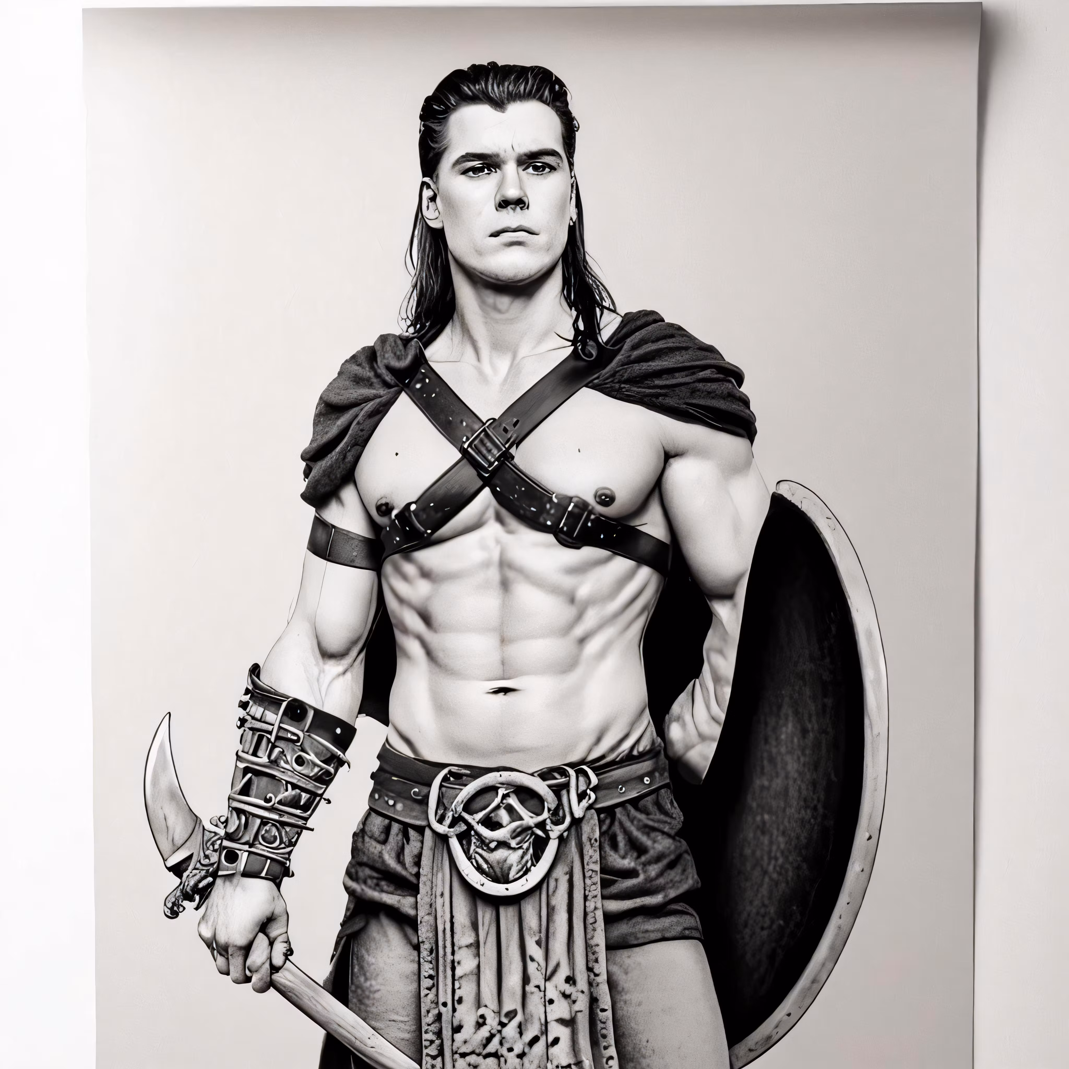 High resolution picture, free to use, a drawing of a man holding a sword and a shield
