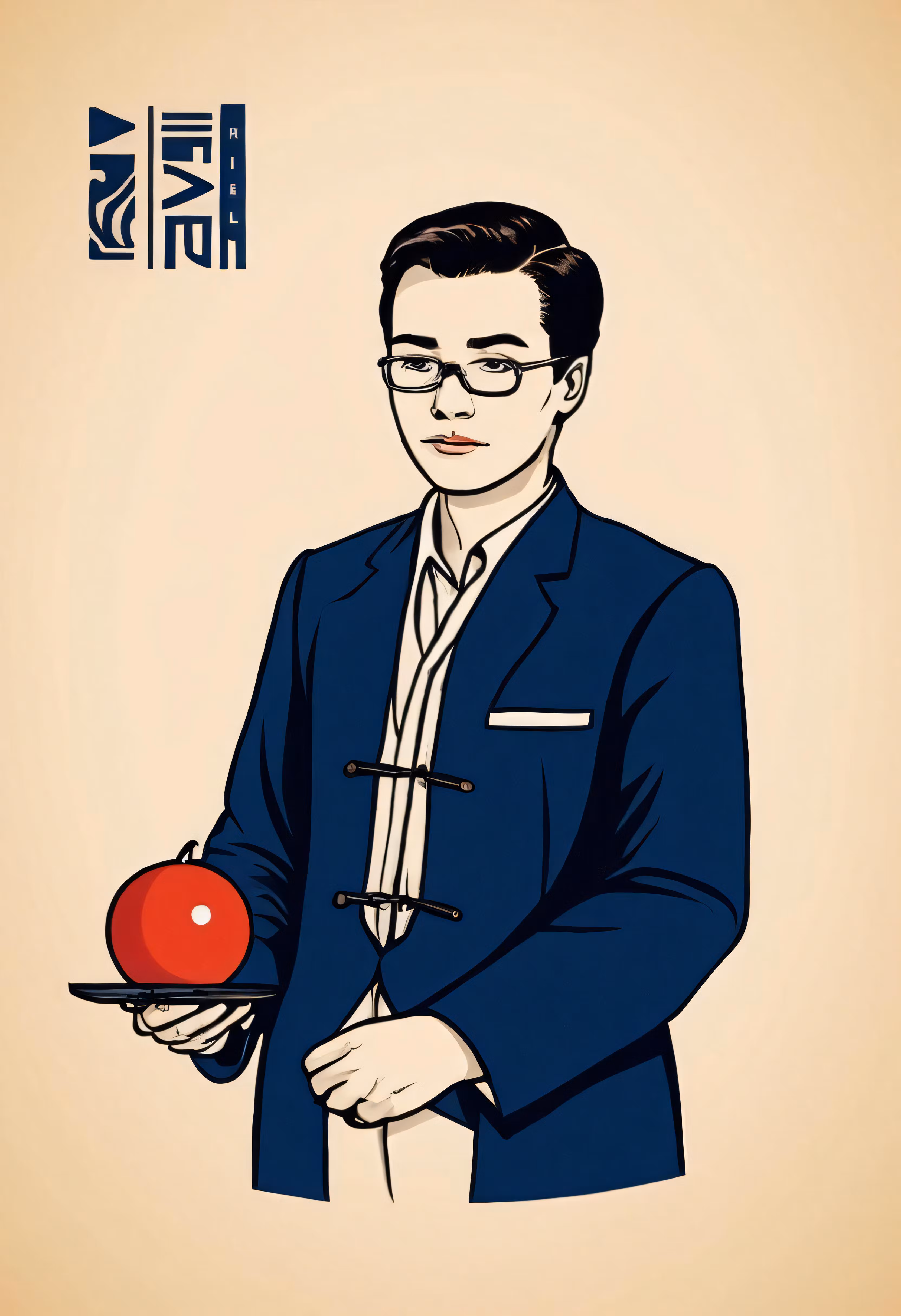 High resolution picture, free to use, a drawing of a man in a business suit holds up an apple