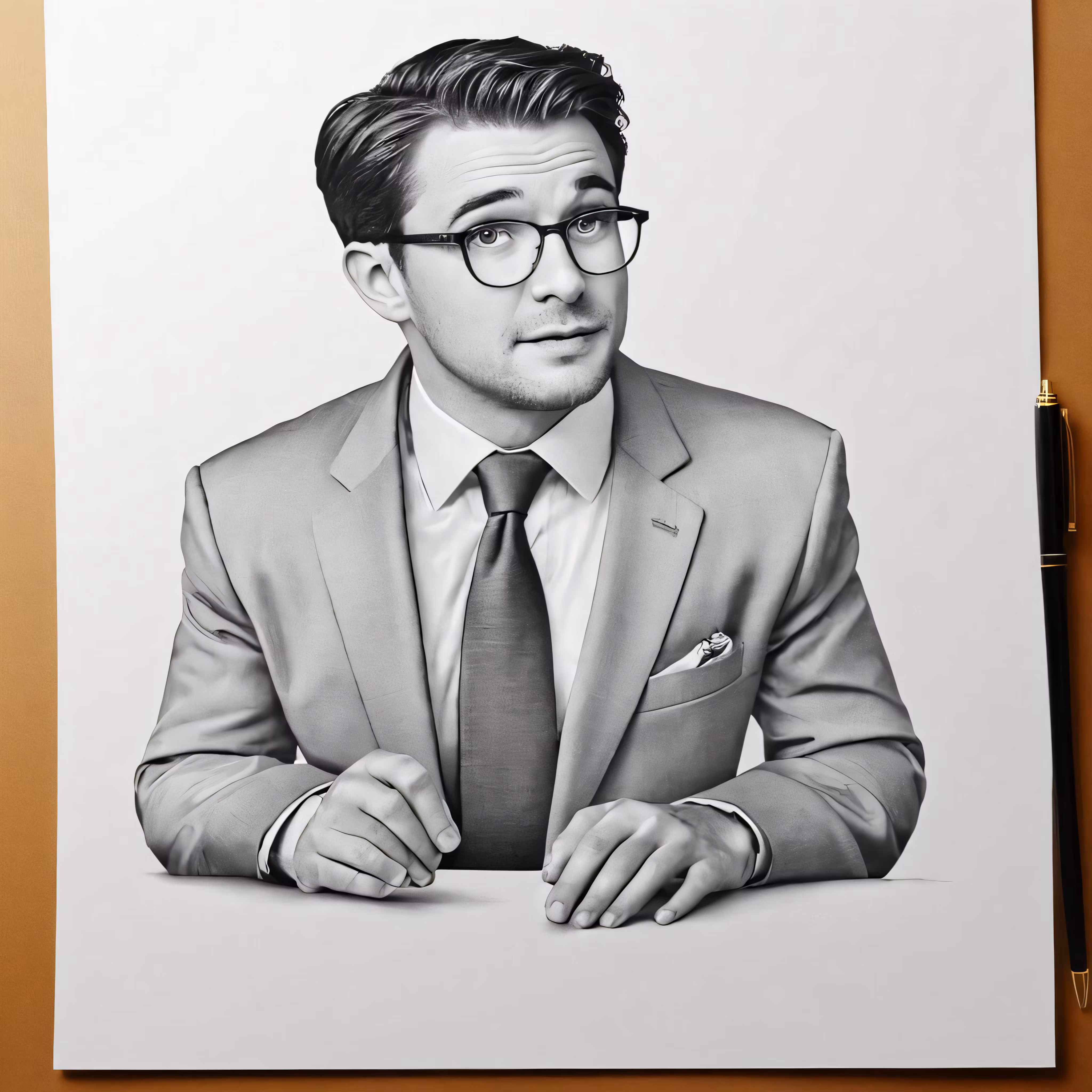High resolution picture, free to use, a drawing of a man wearing glasses sitting at a table