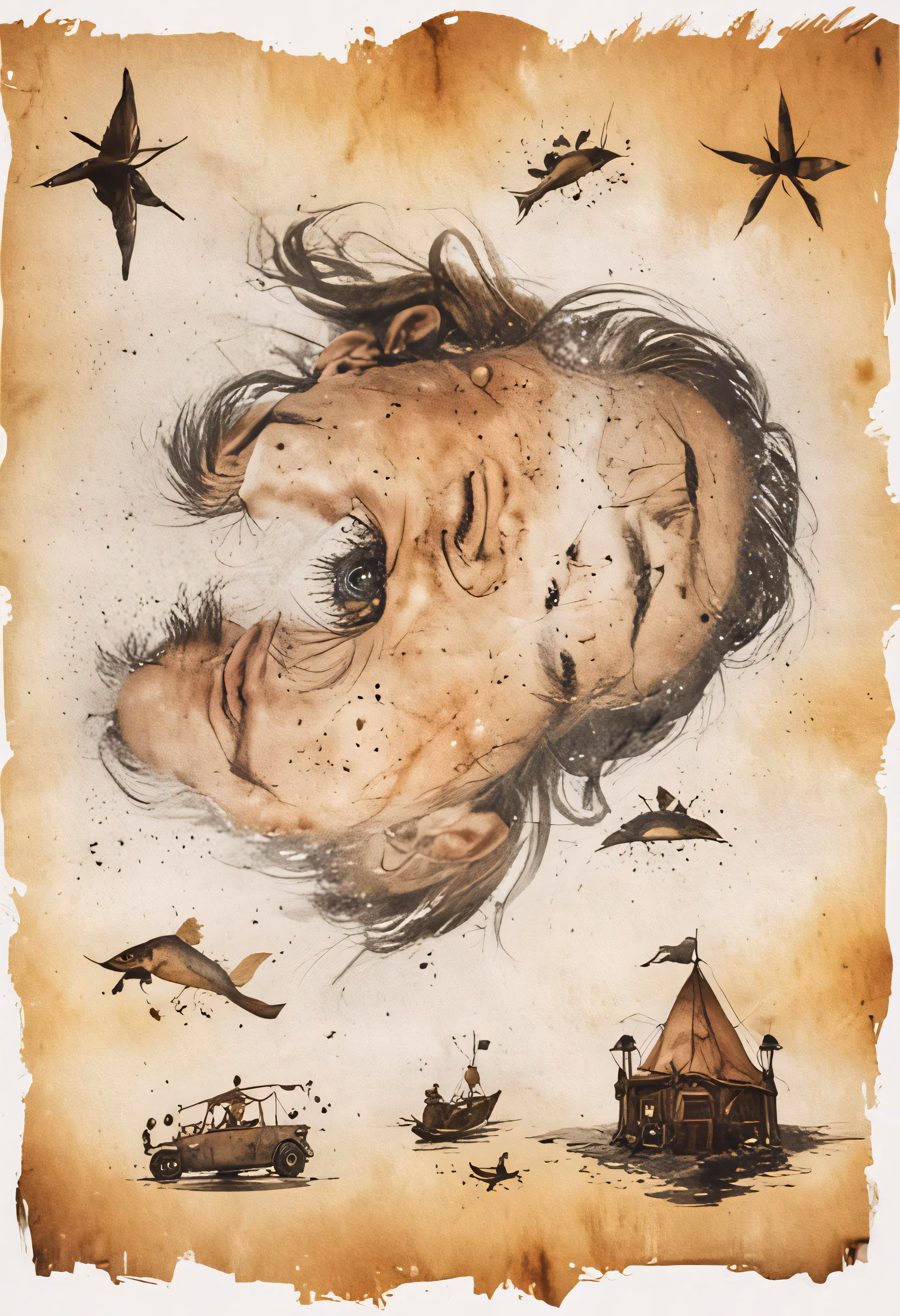 High resolution picture, free to use, a drawing of a man with long hair floating around