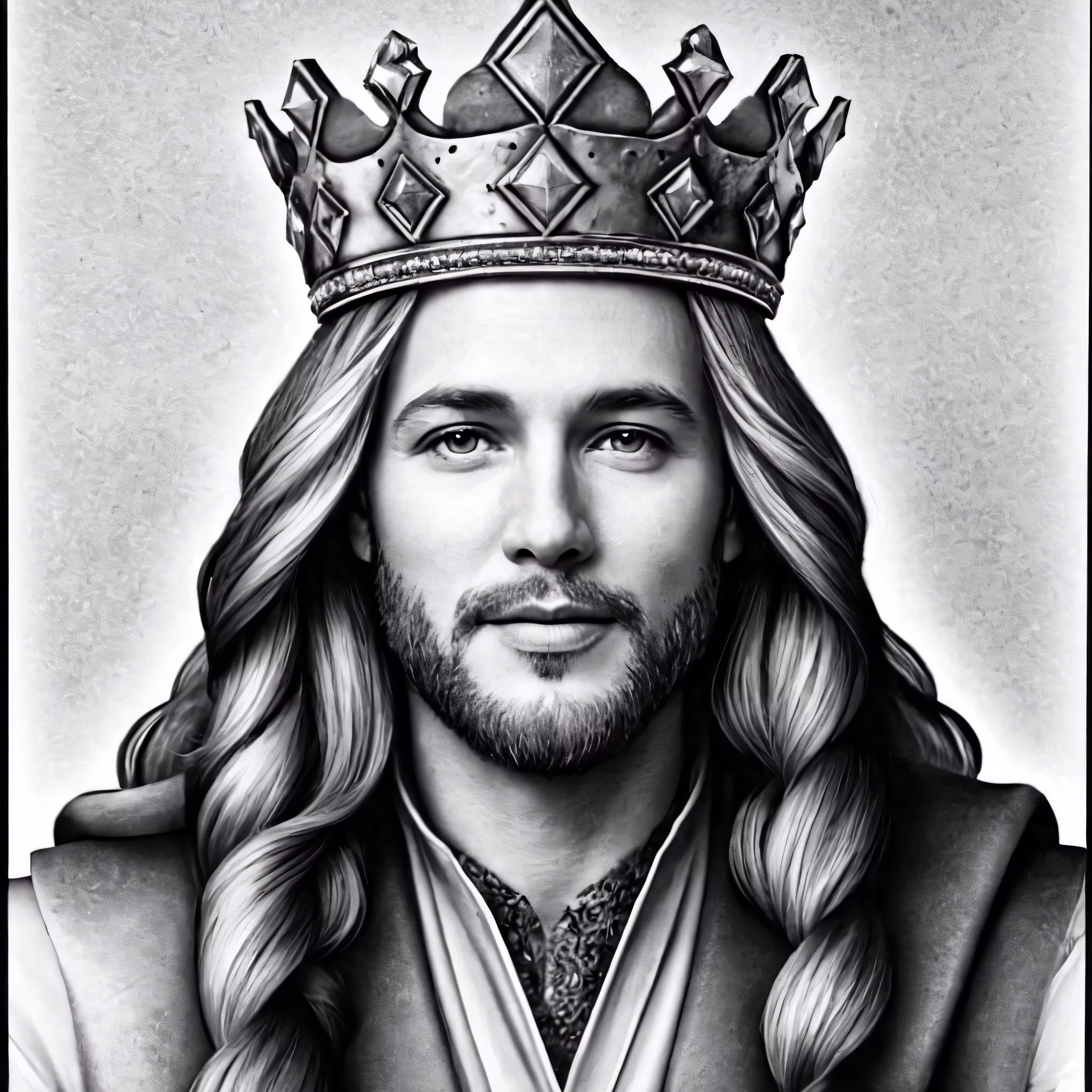 High resolution picture, free to use, a drawing of a man with long hair wearing a crown