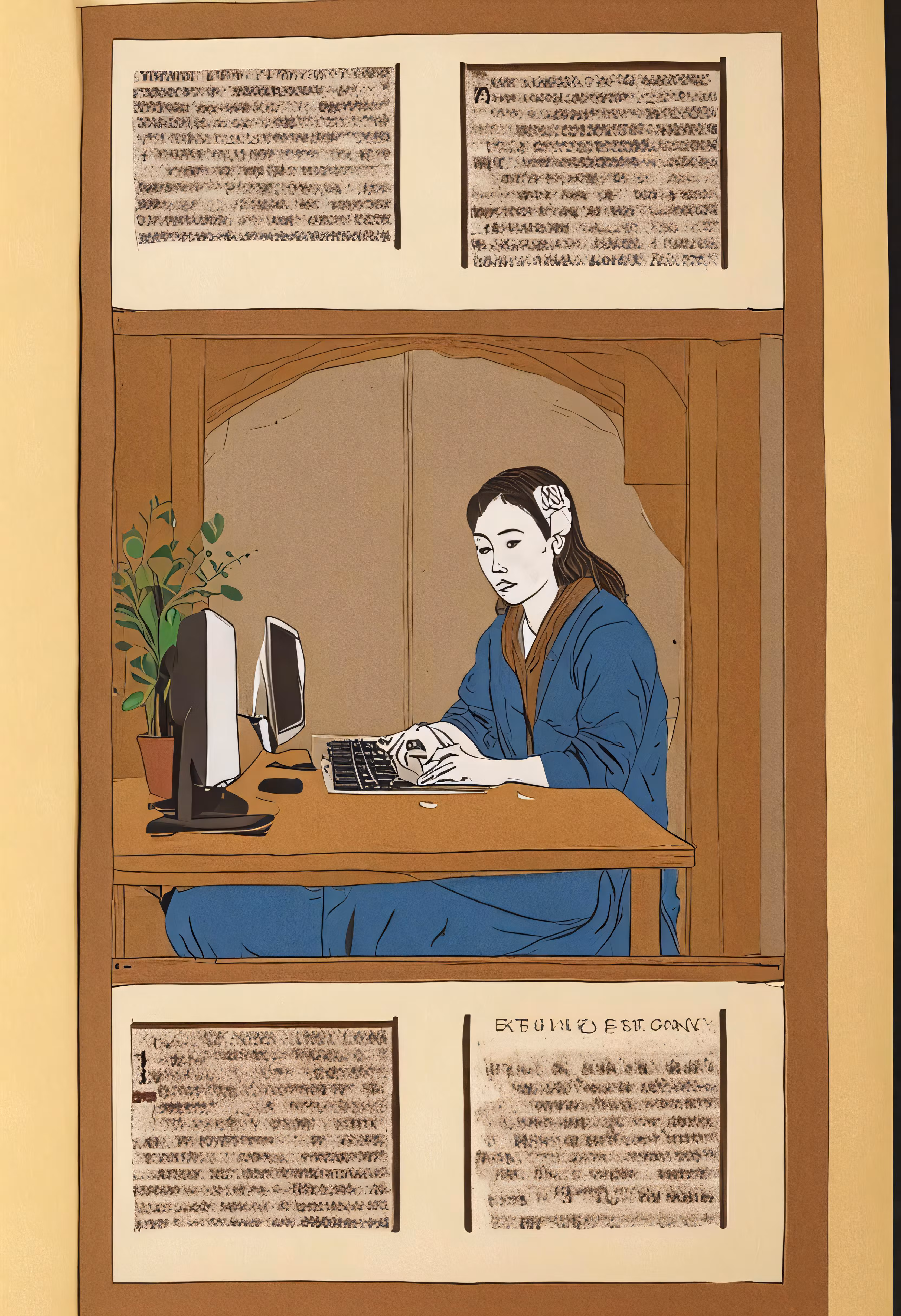 High resolution picture, free to use, a drawing of a person on a computer in front of a book with several different writing
